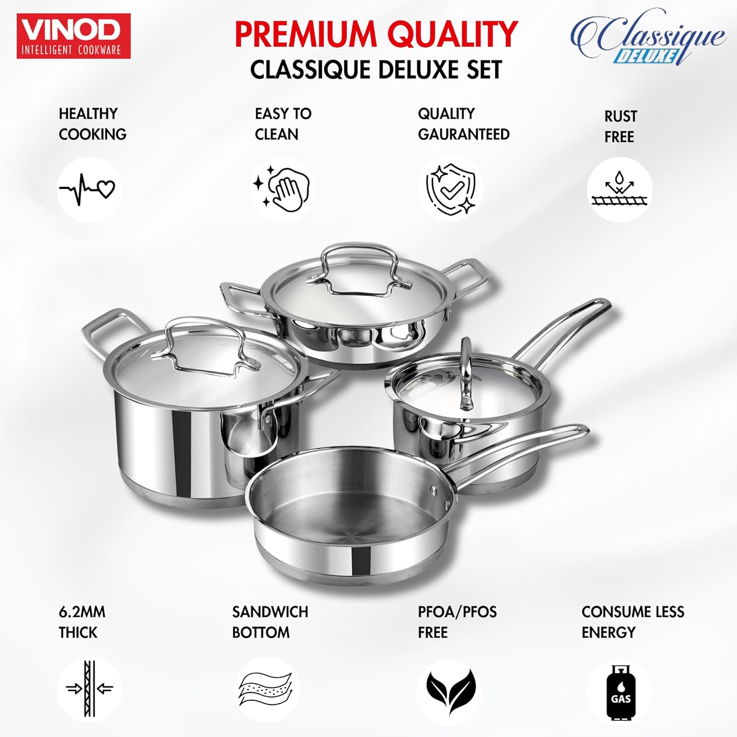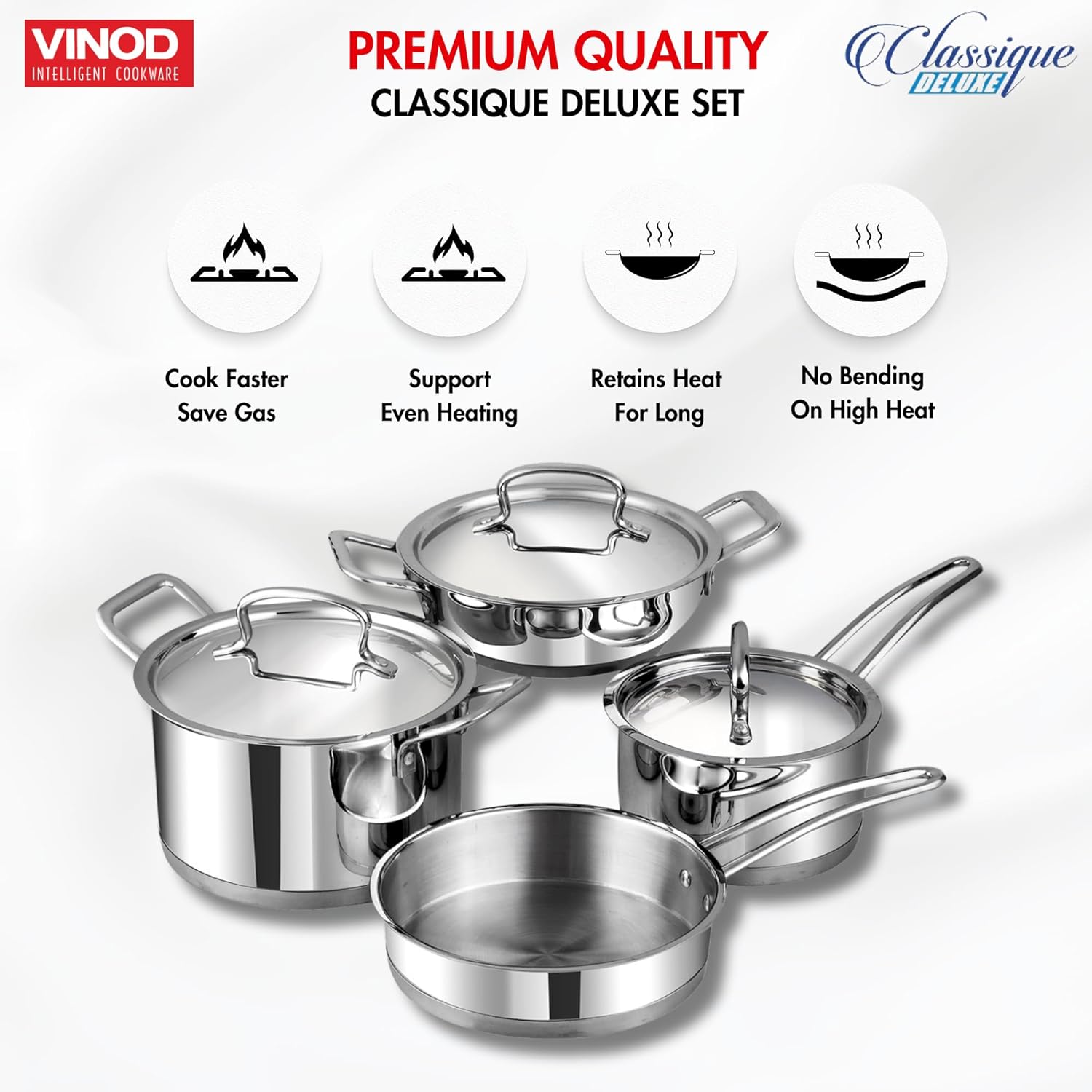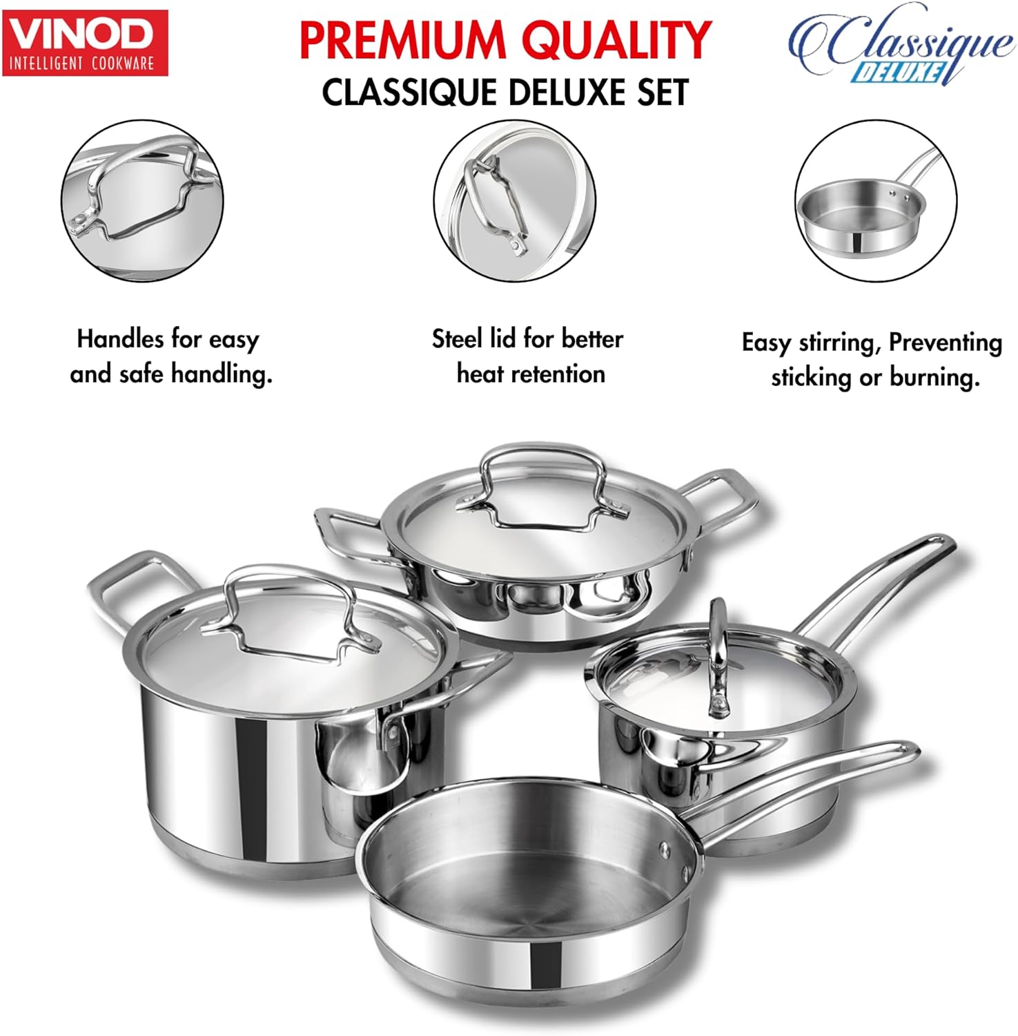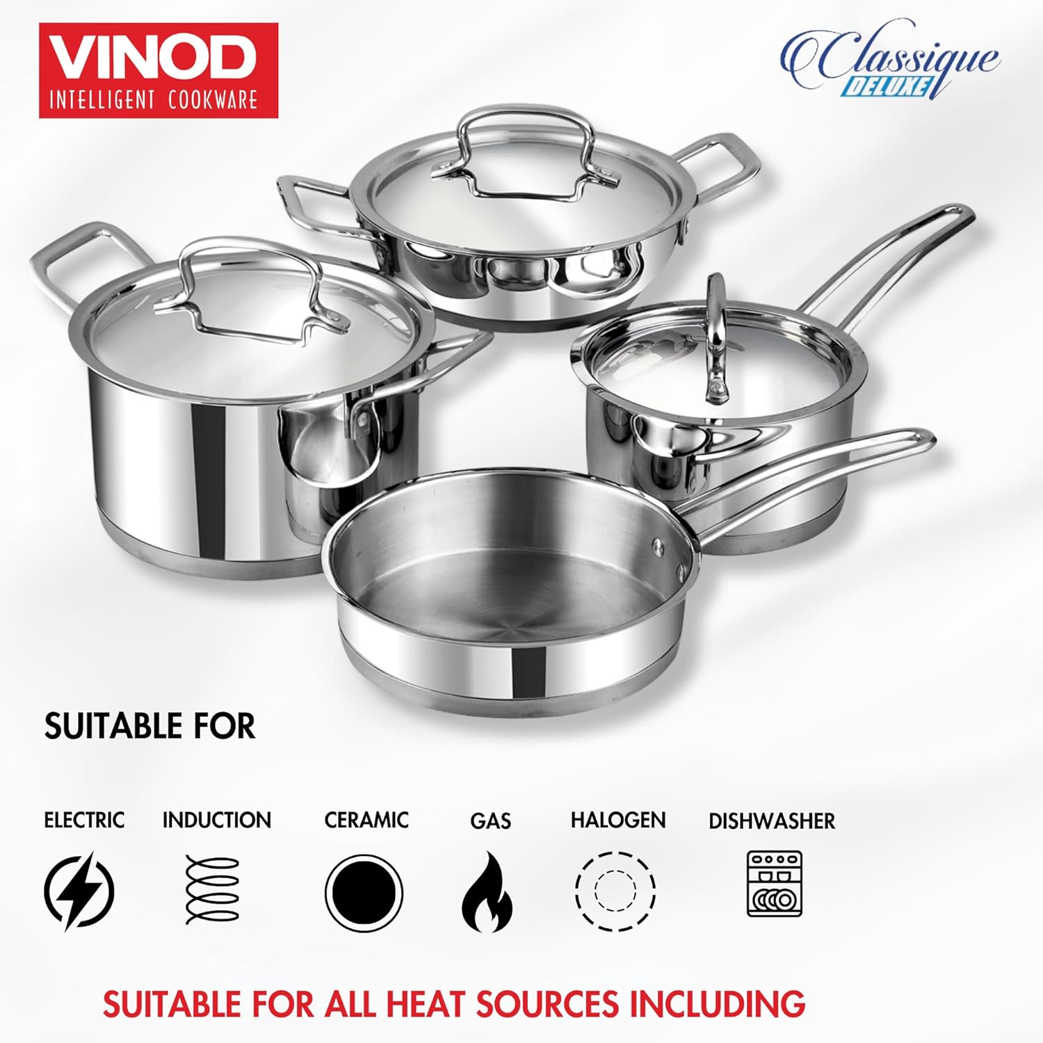 Vinod Stainless Steel Induction Friendly Classic Deluxe Combo 4 Pcs Set - Saucepan (16 cm/2.1 Litres) with Lid, Saucepot (18 cm/2.7 Litres), Kadai with Lid (20 cm/1.8 Litres) & Frypan (20 cm) - Silver
