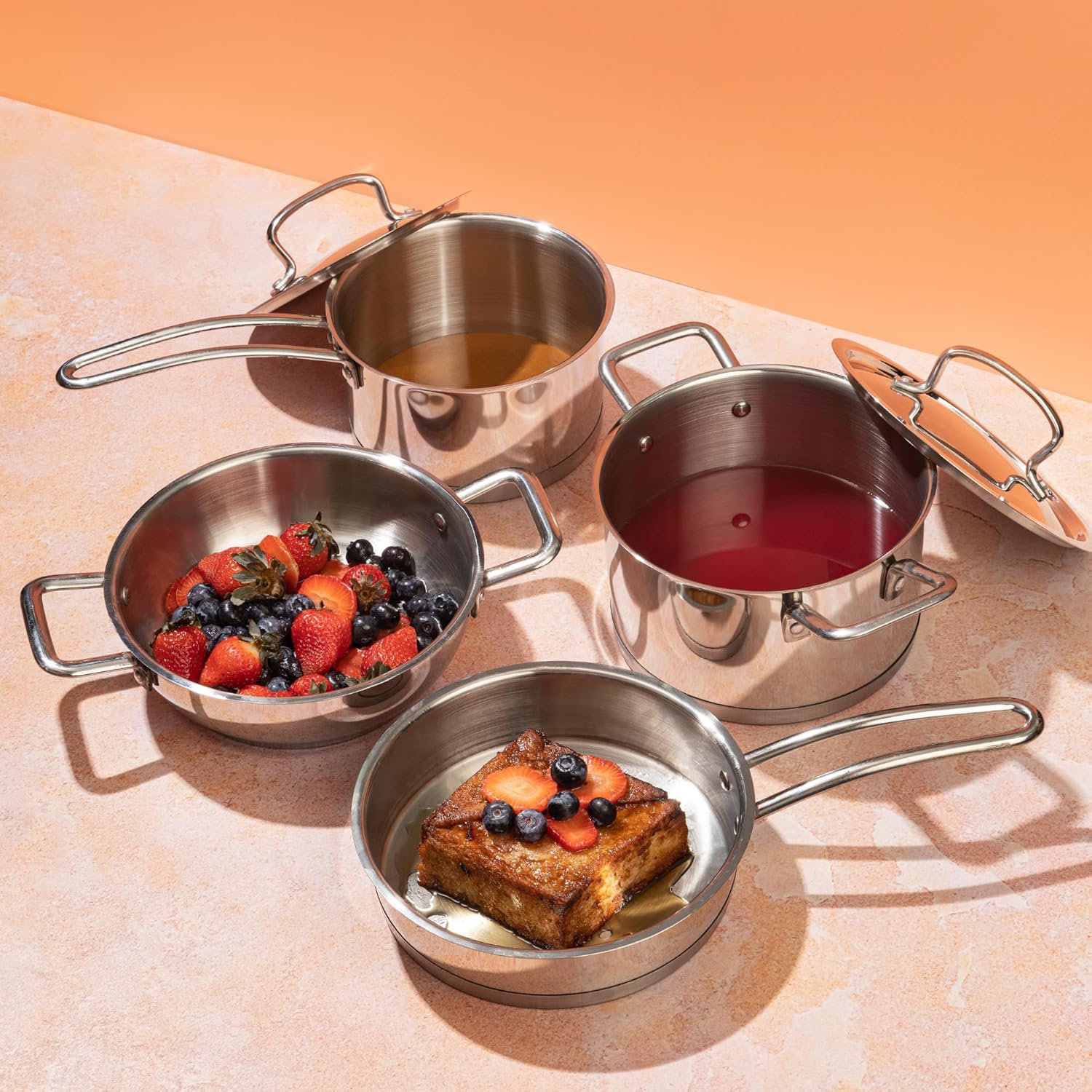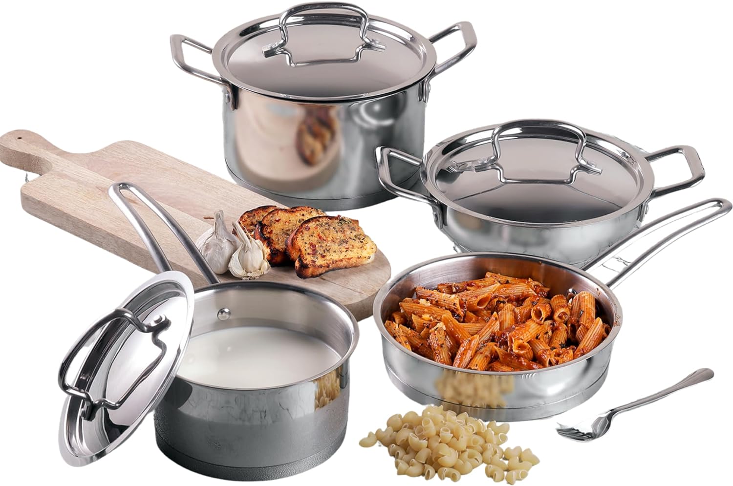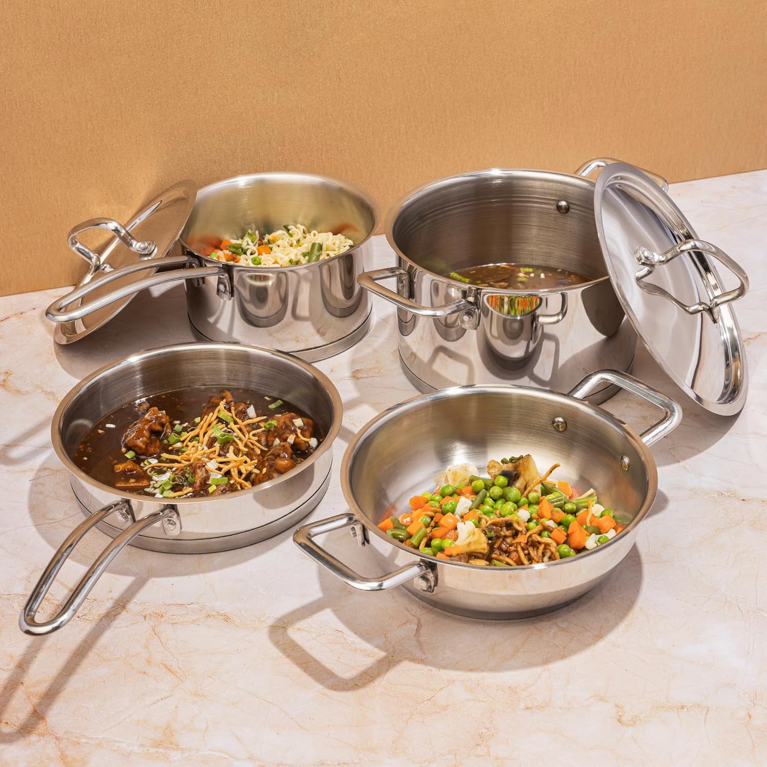 Package Content:1- Piece Stainless Steel Saucepan (16 cm/2.1 Litre), 1- Piece Stainless Steel Saucepot (20 cm/ 3.8 Litre), 1-Piece Stainless Steel Kadai (20cm/ 1.8 Litre),1-Piece Stainless steel Frypan (20cm) and 3- Pieces Stainless Steel Lids