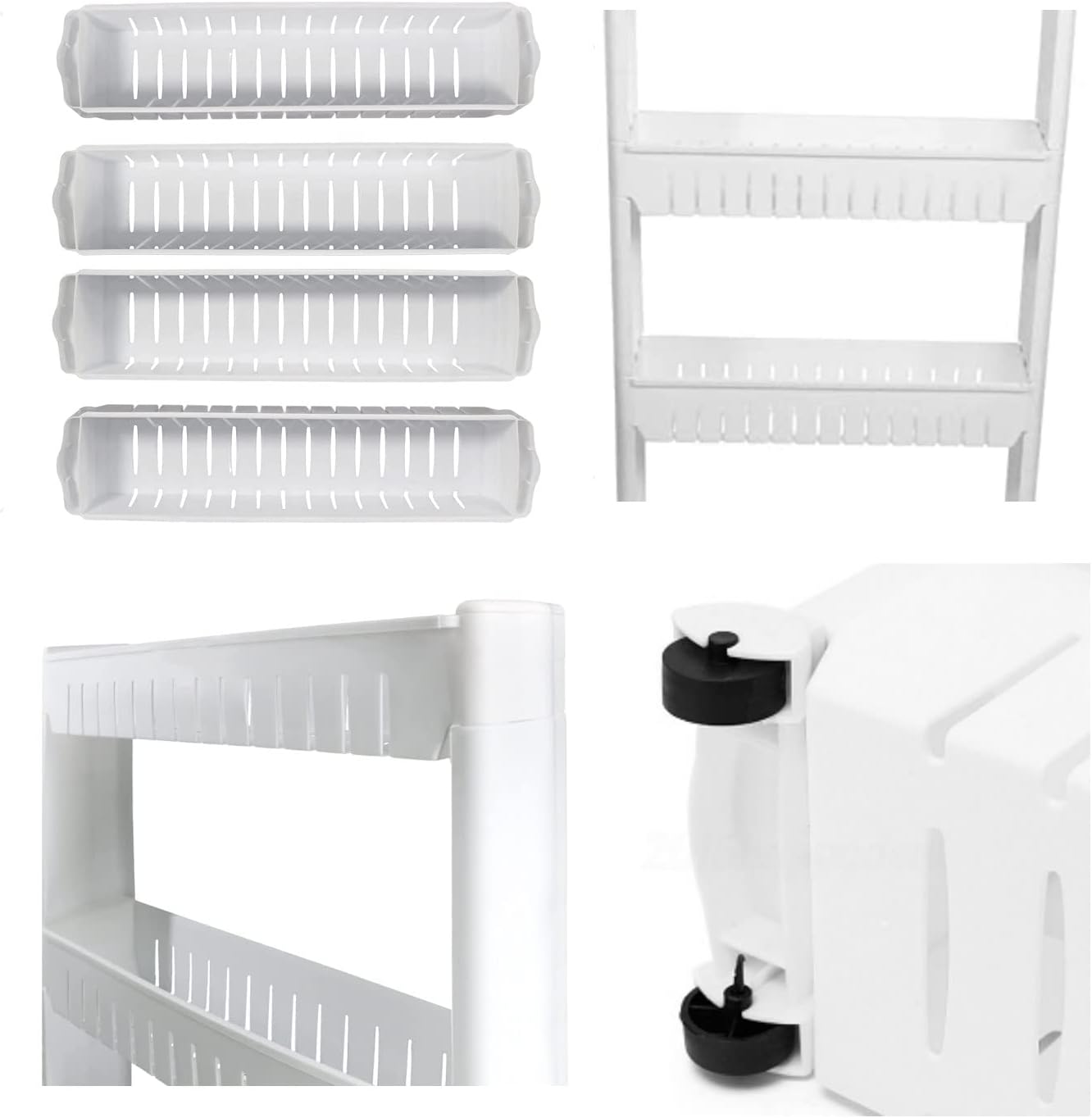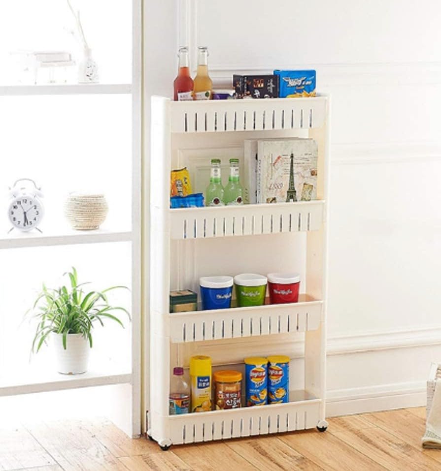 【Large Capacity & Flexible】The 4 tier slim storage trolley cart is designed perfectly for tight space utilization at home. This rolling storage cart is ideal for closet, kitchen, bathroom, garage, laundry room, office, dorm, libraries or in-between your washer and dryer. Easy to store and transport.