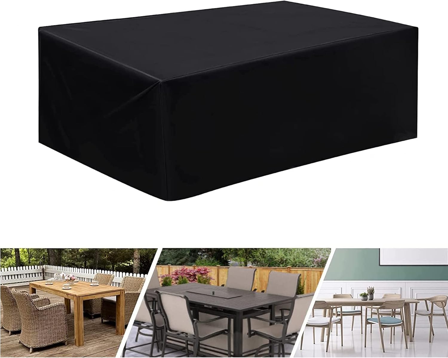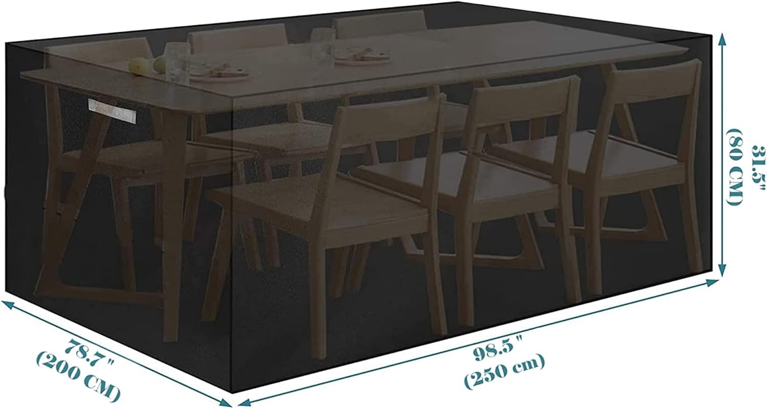 Product size: 250 x 200 x 80 cm / 98.42 x 78.74 x 31.49 inches. Suitable for almost all daily use furniture items such as dining set, table, and 4 seat chairs, picnic table, rattan furniture set, sofa set, etc. It can also be used indoors or outdoor like a balcony and in gardens. Our Patio Table Cover mostly suits your furniture with its size.