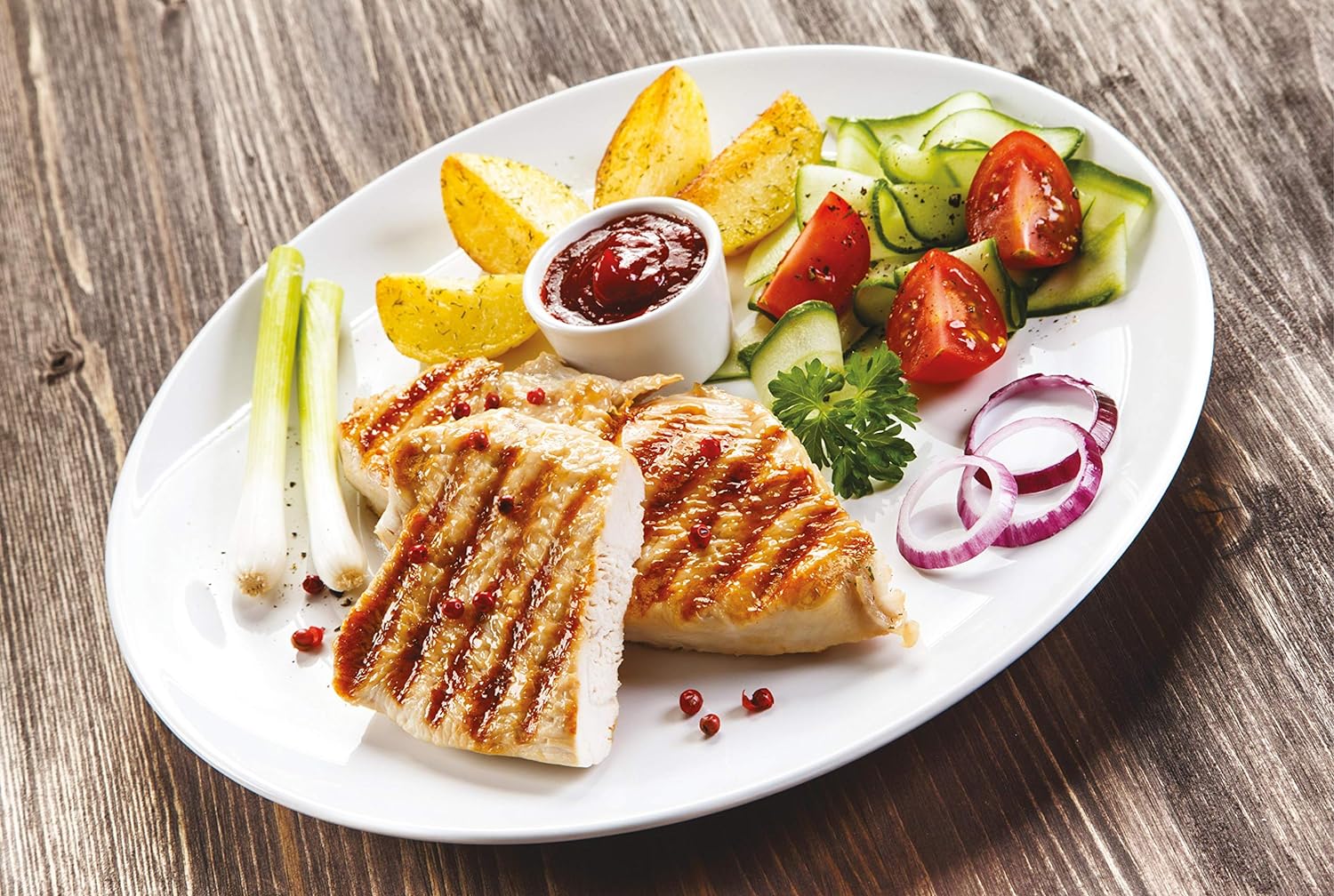 Non-stick coated cooking plates for easy cleaning. Space-saving vertical storage.