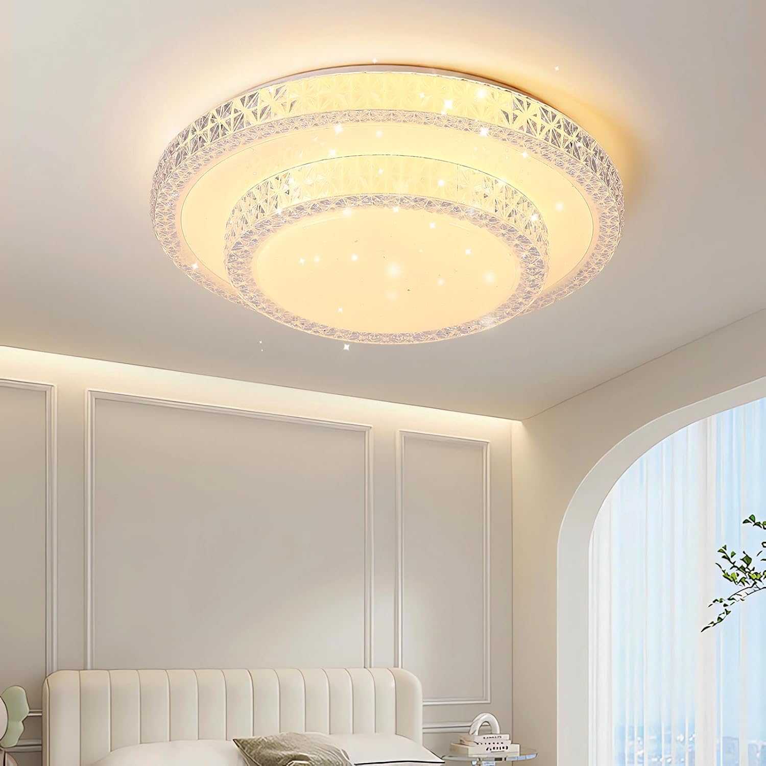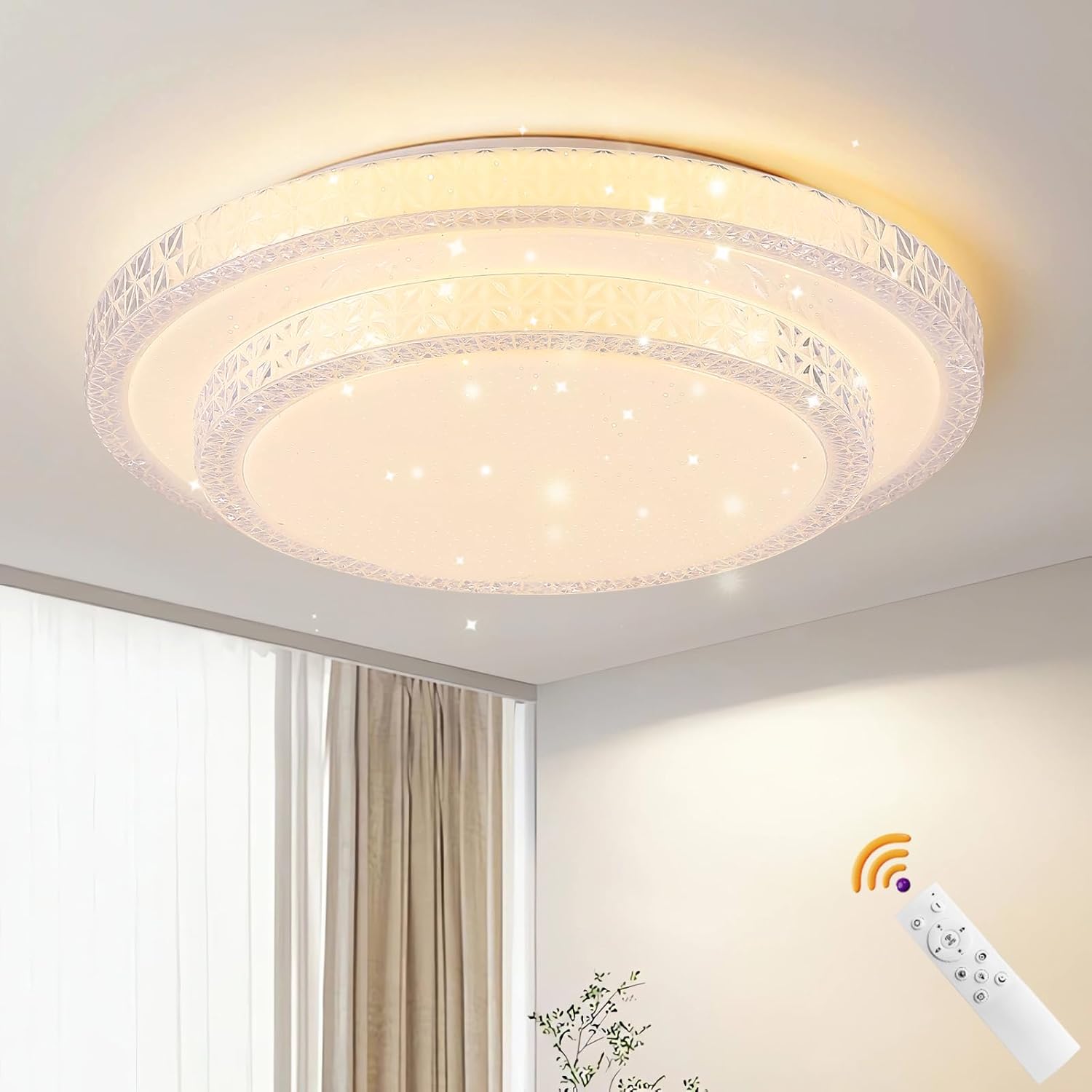 Contemporary Elegance: Immerse your living space in the modern charm of our remote-controlled round LED ceiling light. The crystal-inspired design, highlighted by a sparkling edge and a diffuser surface adorned with a starry sky decoration, seamlessly marries functionality with aesthetics.