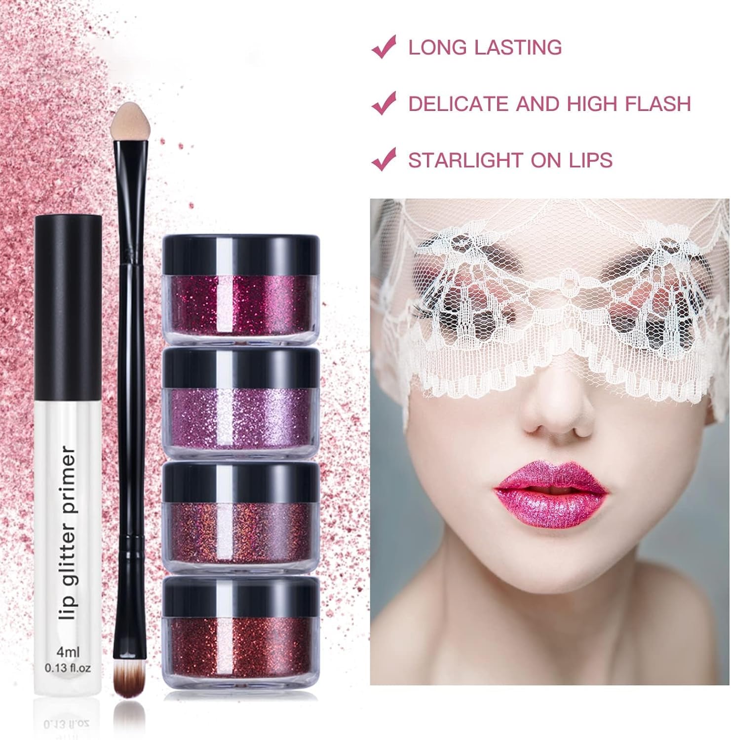 Kawaii Kisses Glitter Lip Kit, 4 Colors Glitter Lip Kit Gloss, Shiny Diamond and Metallic Lip Glitter Makeup Lipstick Lip Gloss Glitter Lipstick, Glitter Lips Makeup with Lip Primer and Brush