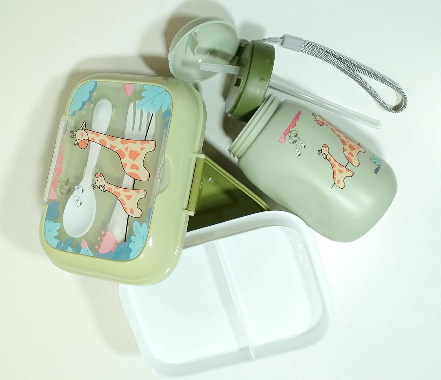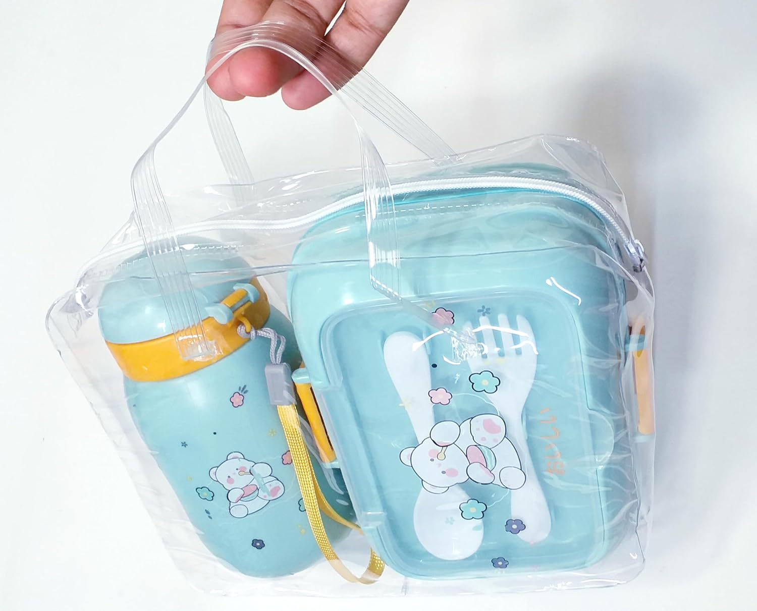 Lunch box water bottle set for kids school - Our lunch bag features transparent plastic and a zip closure for easy access. The rigid plastic lunch box includes a removable lid and compartments, complemented by a spoon and fork. The BPA-free water bottle completes the set for safe and convenient meal packing.