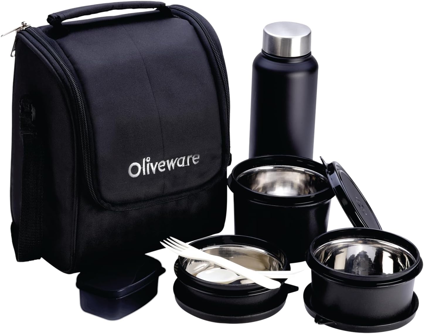 Oliveware Teso Lunch Box with Bottle Black | 3 Stainless Steel Containers and Pickle Box and Assorted Steel Bottle | Insulated Fabric Bag | Leak Proof Microwave Safe | Full Meal and Easy to Carry