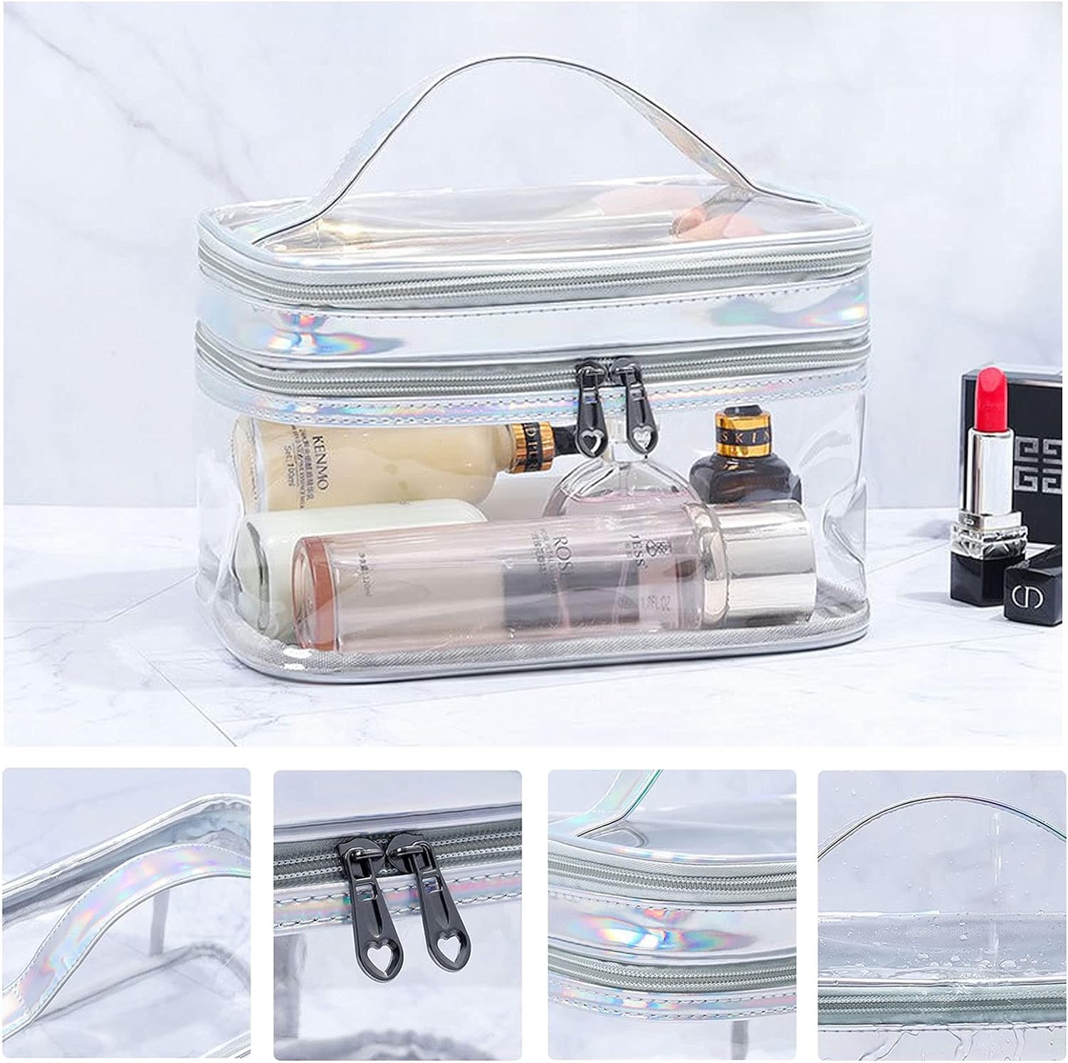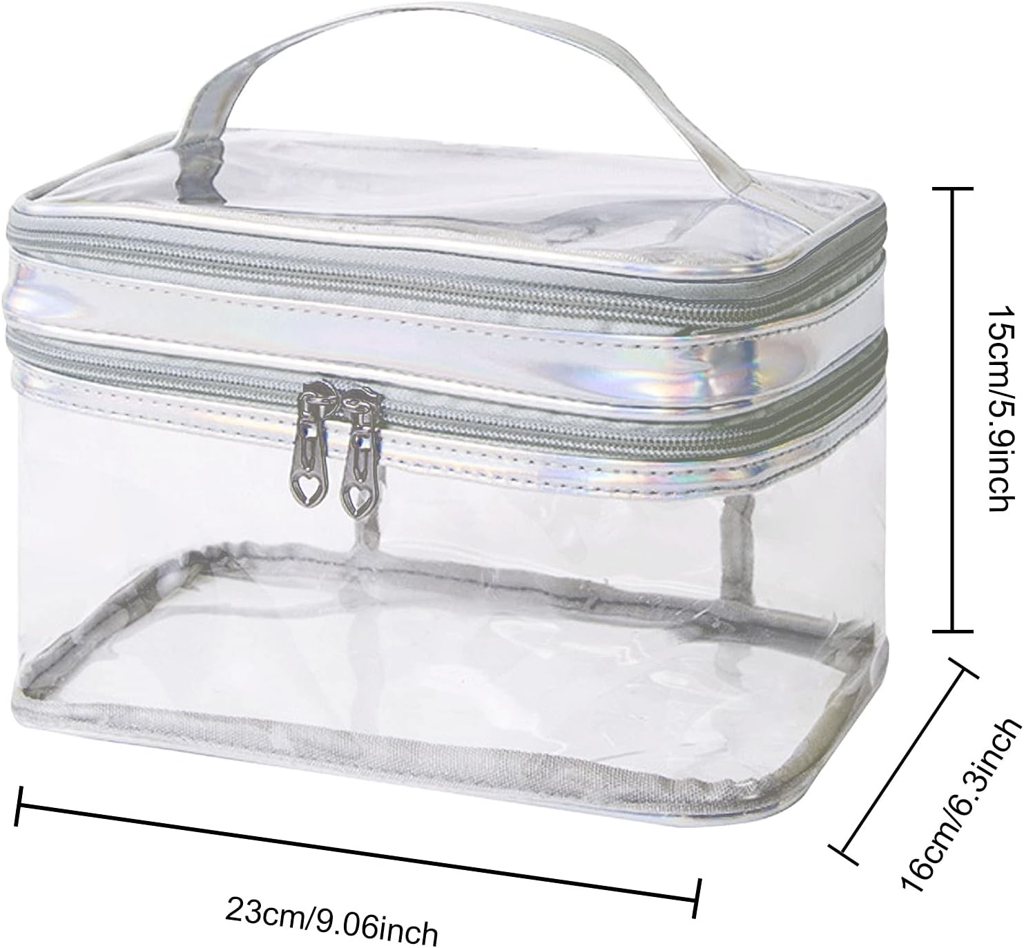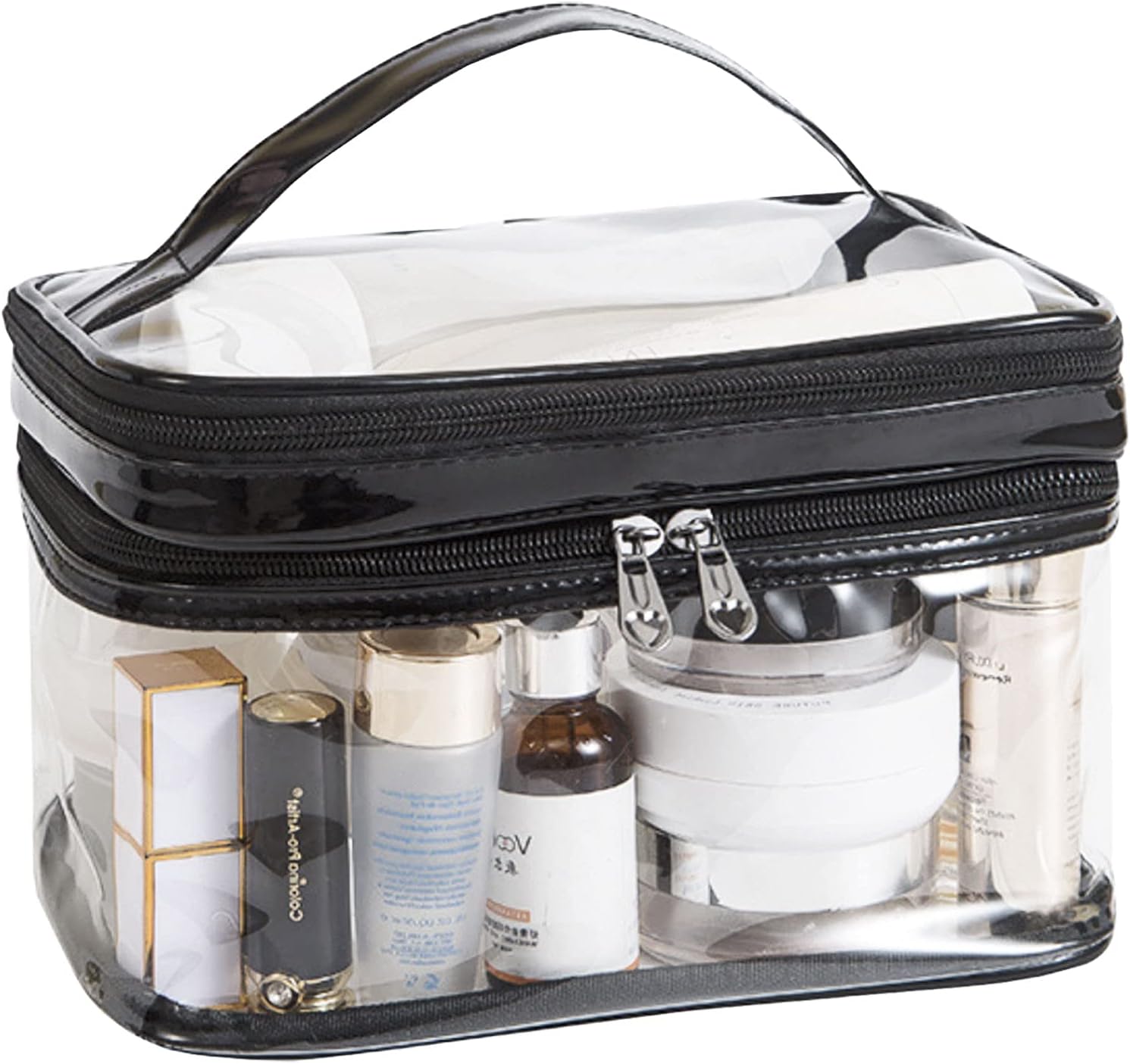 Dual Layer Cosmetic Bag: the double layer design makes you easy to sort your makeup things, provide enough space to store your cosmetics, the up layer can be used as brushes organiser, separated from the other products, convenient to find what you need Transparent Design: durable clear PVC make it easy to find what you want, what you have stored, and easy to clean, water resistant, lightweight for travel, with top handle easy to carry with Multifunctional: this clear bag can be used as a cosmetic bag, toiletry bag, stationery bag, and wash bag, to carry your daily personal needs, convenient and multipurpose Enough Capacity: size in 23cm x 16cm x 15cm, this clear bag easy to store liquids, shampoo, liquid soap, lotion, perfume, cosmetics, toothpaste, toothbrush, comb,etc Sturdy Cosmetic Bag: reinforced stitching seam and sturdy zipper make sure this clear bag not easy to tear on the seam, offering you a long usage on this bag, happy to travel with it"