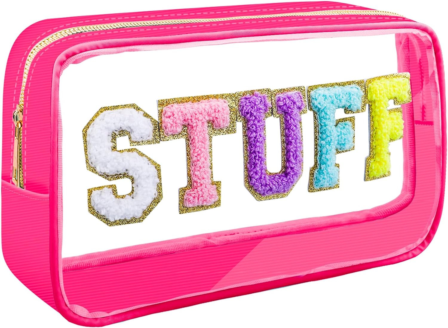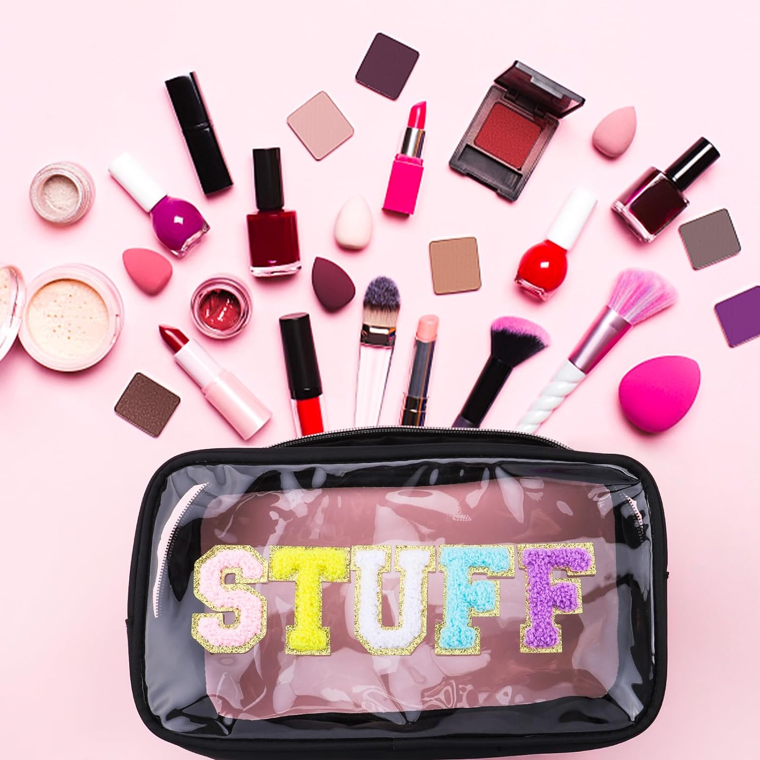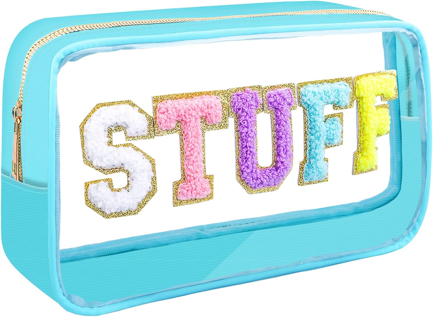 • Unique Design - The makeup bags offer pink, blue and black colors for you. You can choose the color that suits you according to your personal preference and style. The front of the bag has a unique stitch chenille letter. Colorful chenille, glitter varsity letter patches and a gold zipper made the makeup bag preppy and Unique.