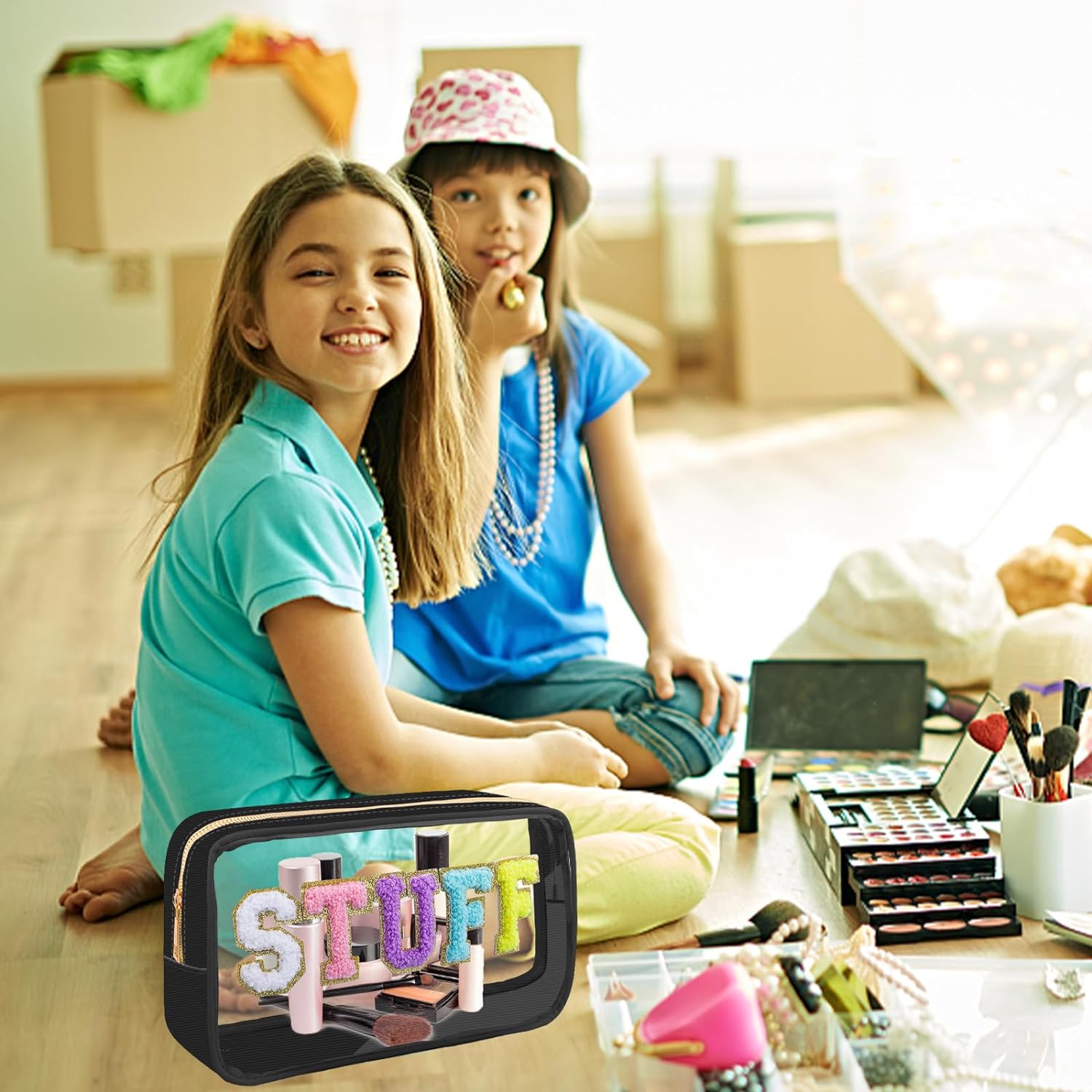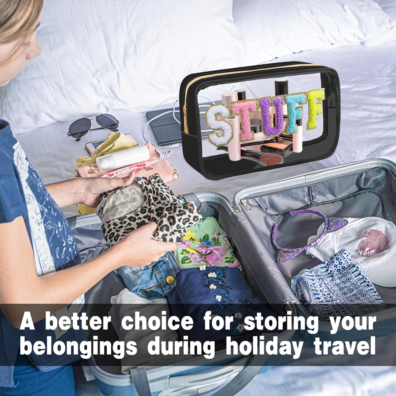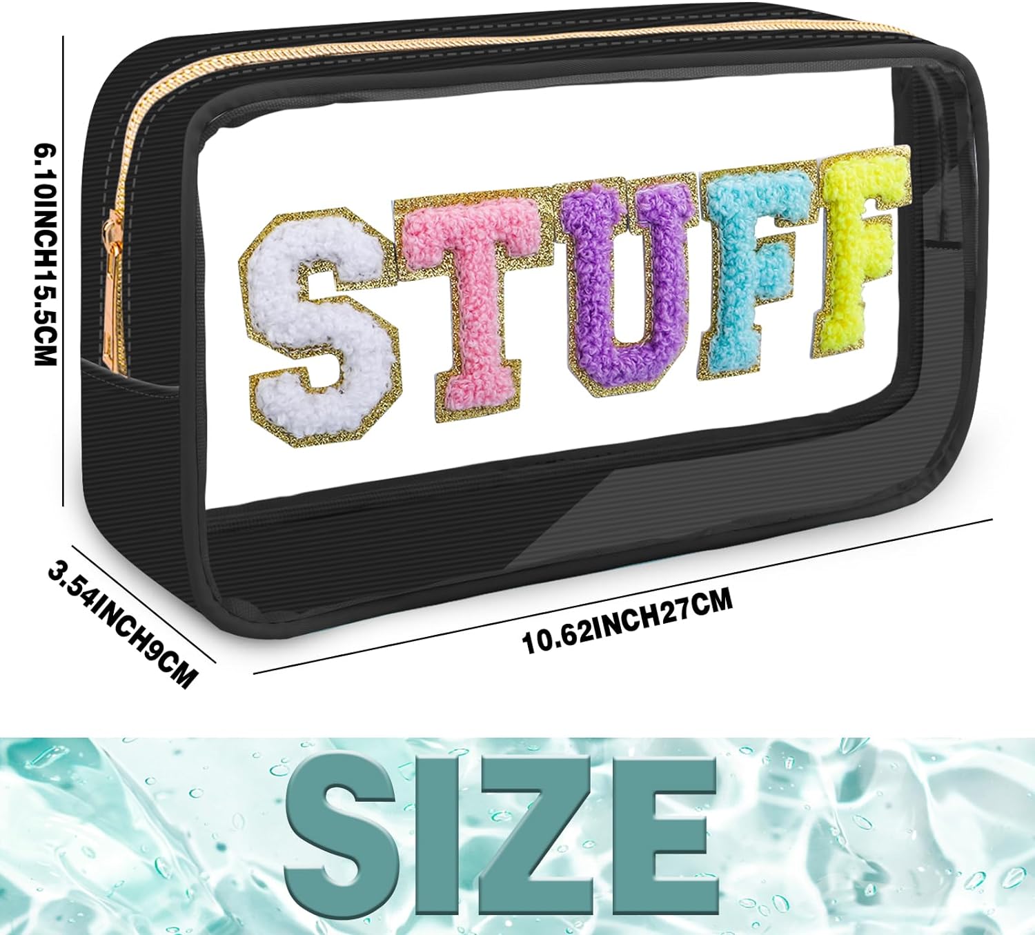 • Unique Design - The makeup bags offer pink, blue and black colors for you. You can choose the color that suits you according to your personal preference and style. The front of the bag has a unique stitch chenille letter. Colorful chenille, glitter varsity letter patches and a gold zipper made the makeup bag preppy and Unique.