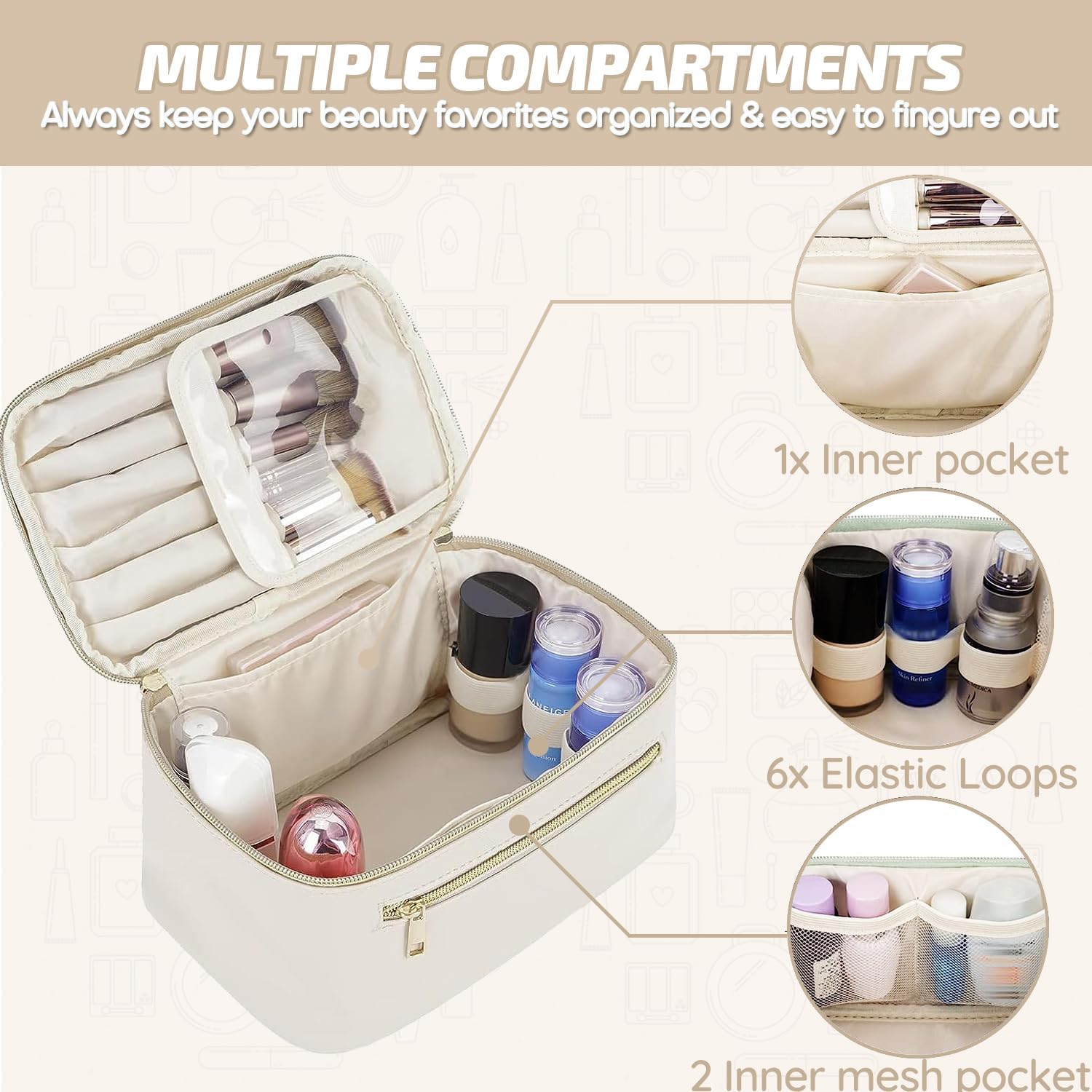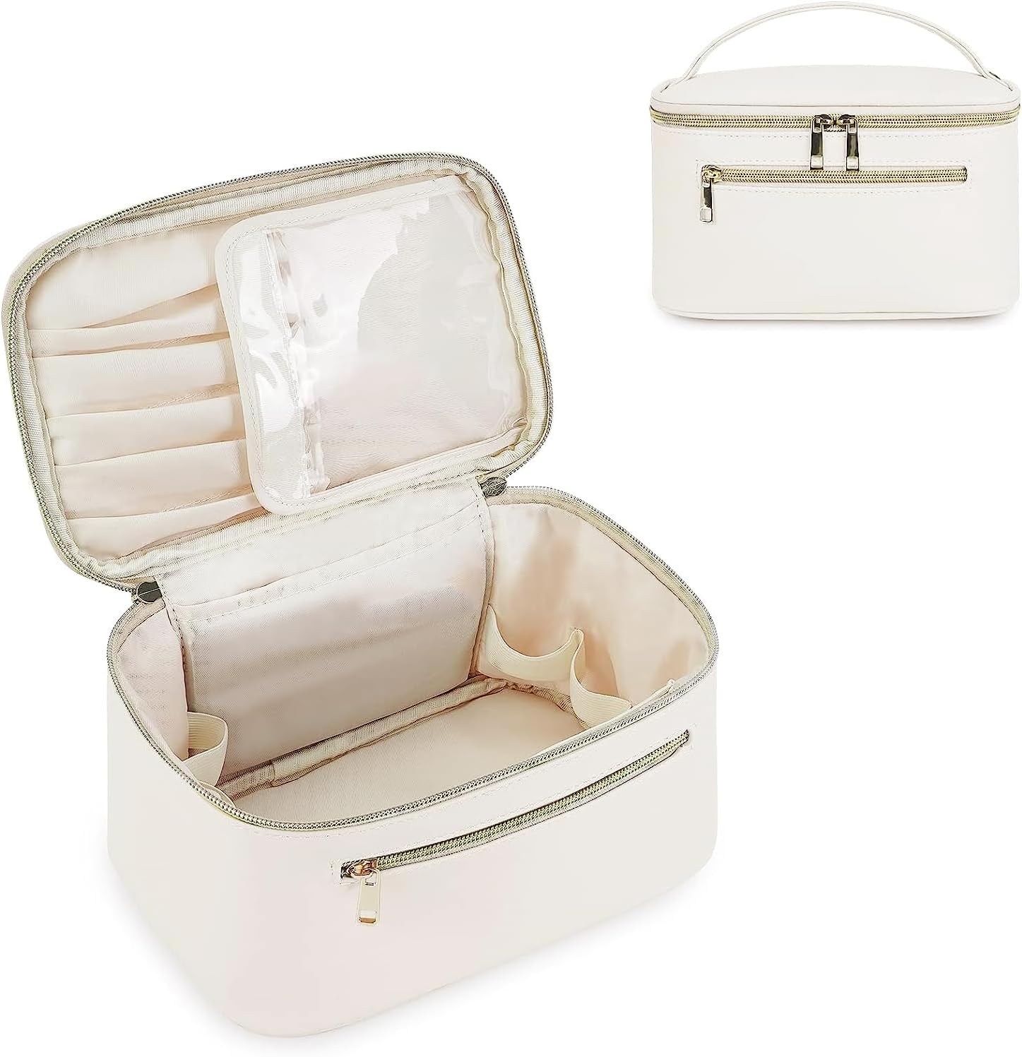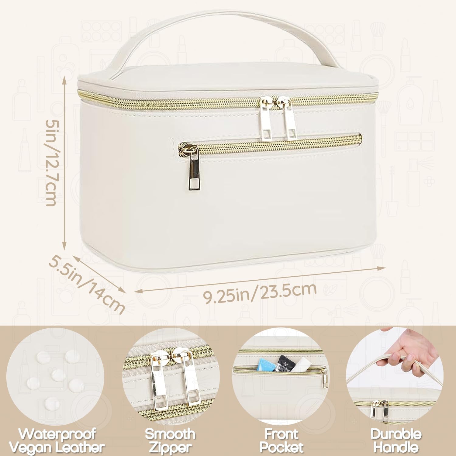 PawPawU Makeup Bag, Travel Cosmetic and Toiletry Organizer, Vegan Leather Waterproof Beauty Washbag with Handle to Keep Your Make up, Brushes, Skincare Products Organized (Beige)