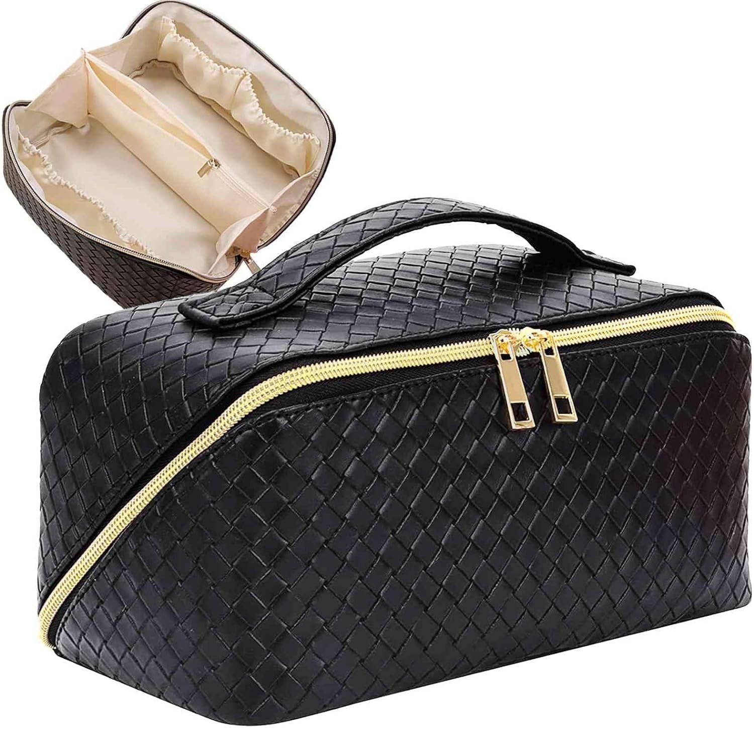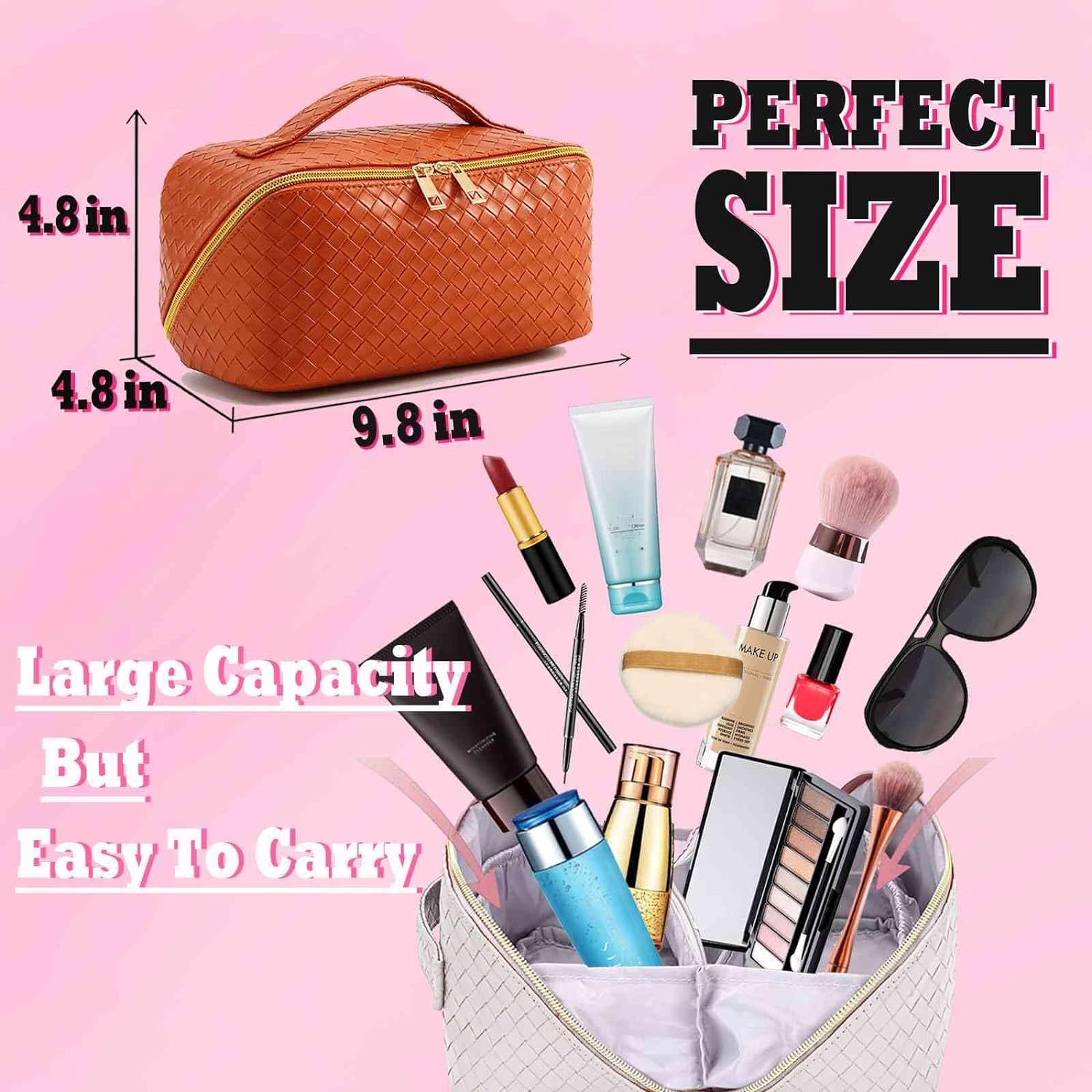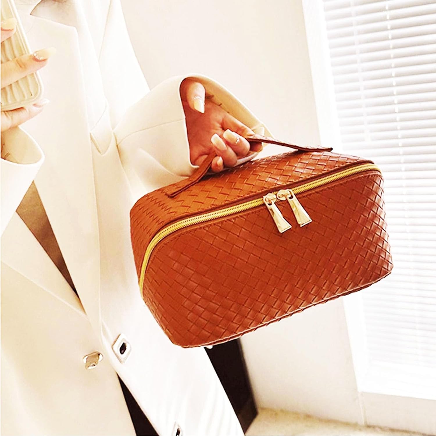 - 【Upgrade PU Leather Fabric】: Tiokkss cosmetic bag is made of upgraded woven PU leather fabric, which has a stylish and unique appearance, easy to clean, and the special waterproof surface prevents the products inside from getting wet. We improve the market similar products appear bad leather, stitching is not neat, zipper easily damaged and other problems. And in the middle of the compartment at the bottom added Velcro, items neatly placed without moving.