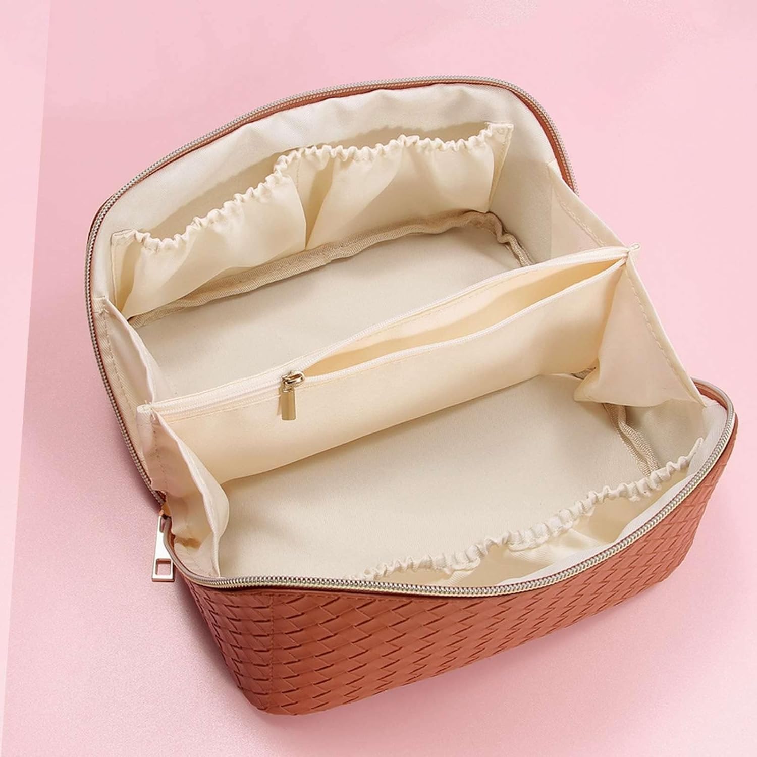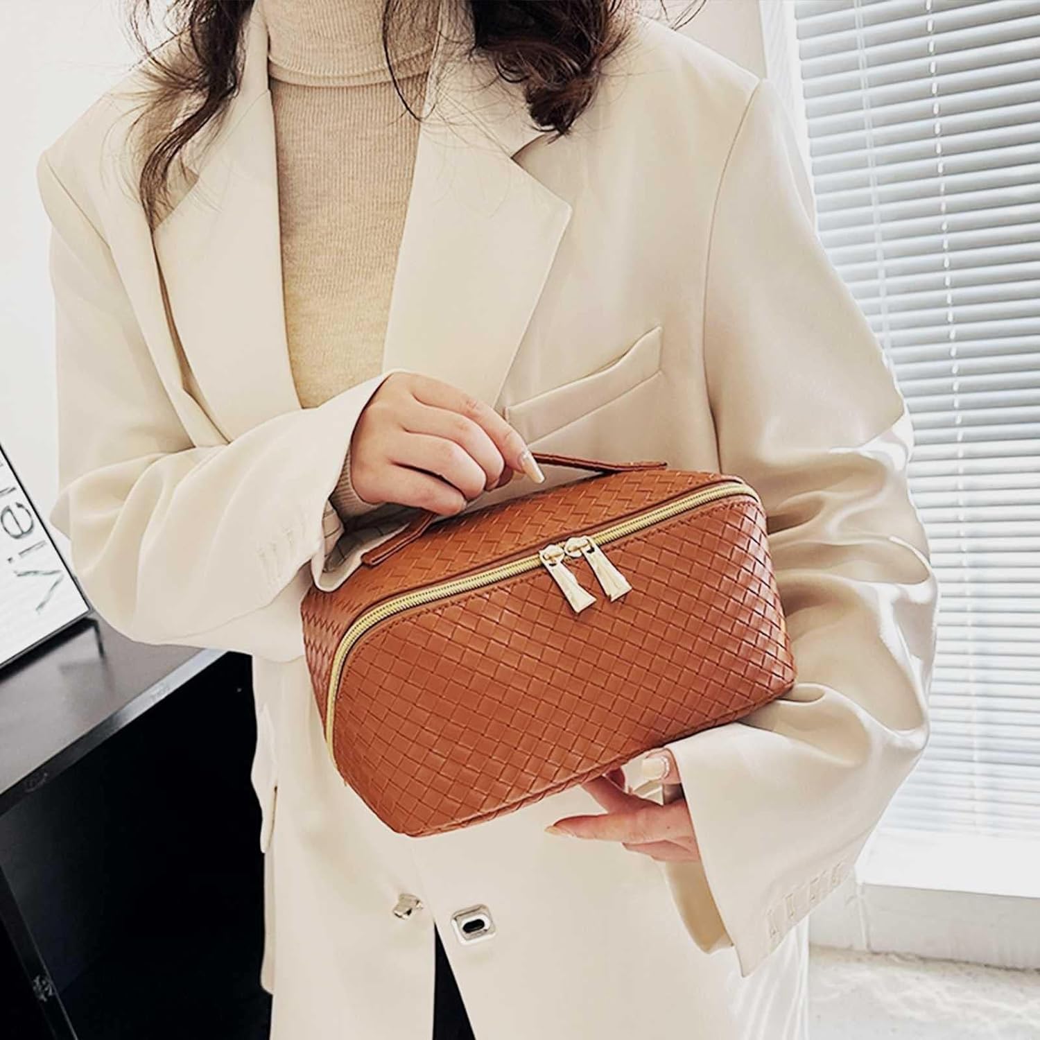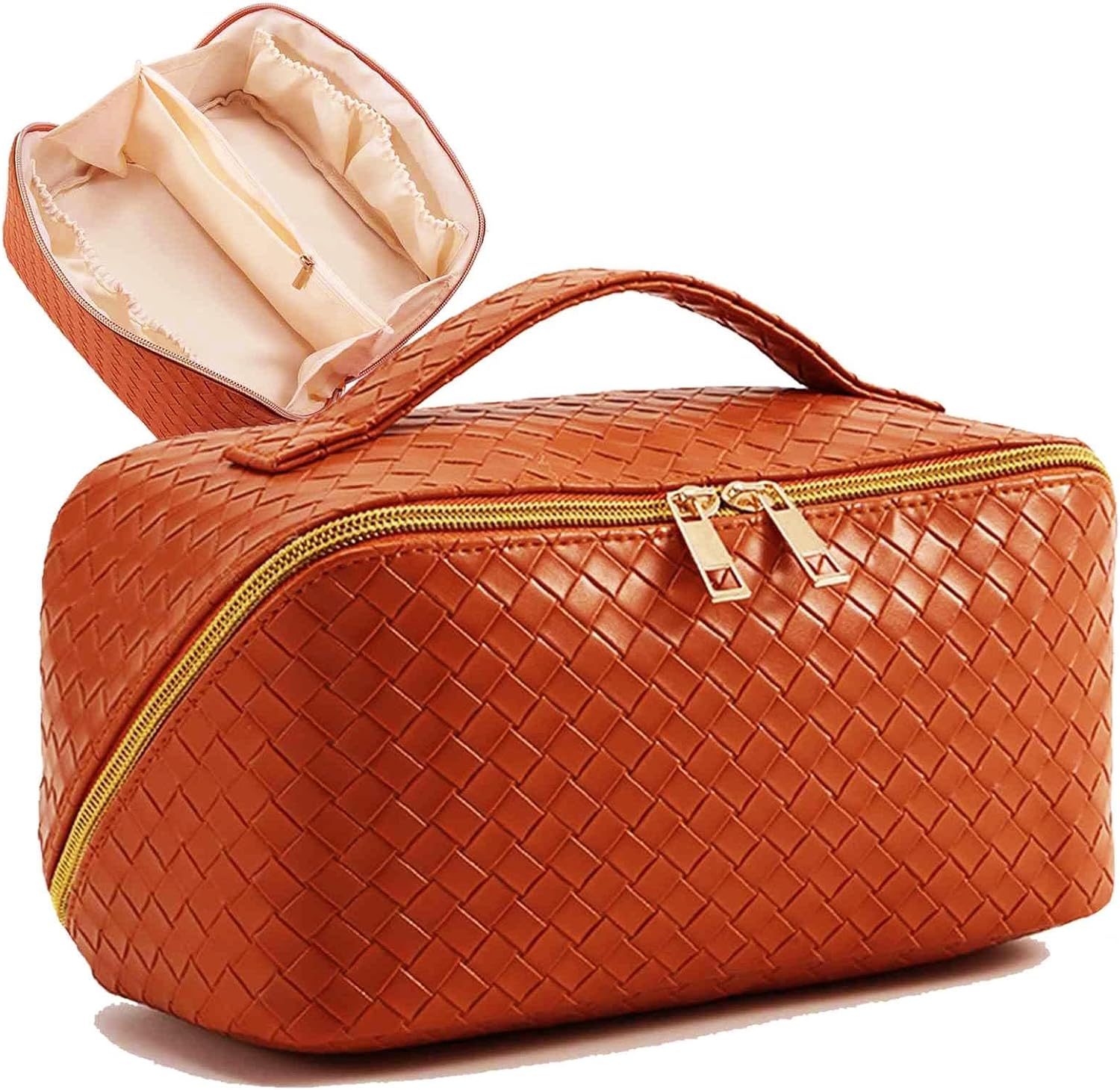 - 【Upgrade PU Leather Fabric】: Tiokkss cosmetic bag is made of upgraded woven PU leather fabric, which has a stylish and unique appearance, easy to clean, and the special waterproof surface prevents the products inside from getting wet. We improve the market similar products appear bad leather, stitching is not neat, zipper easily damaged and other problems. And in the middle of the compartment at the bottom added Velcro, items neatly placed without moving.