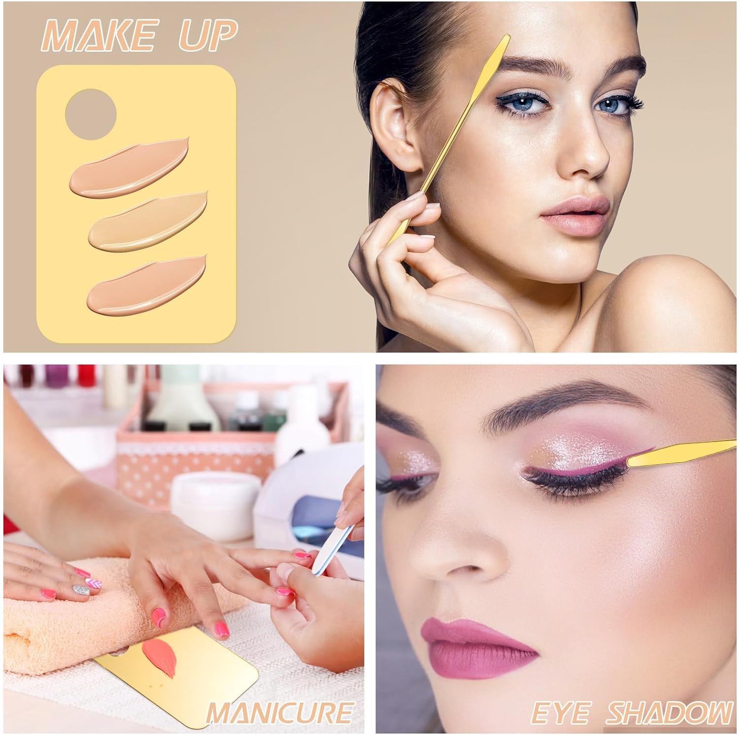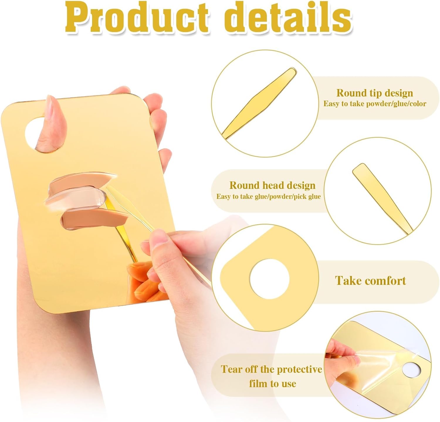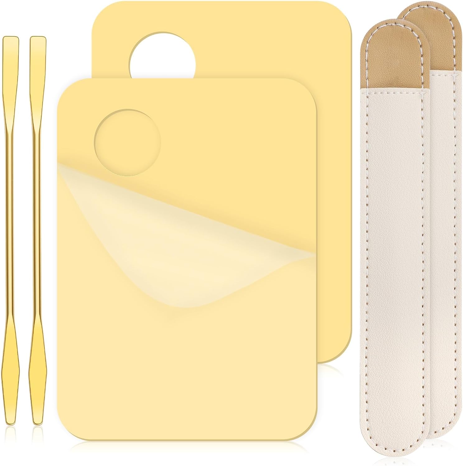 NALACAL 6 in 2 Sets Makeup Mixing Palette: Unleash Your Creativity with Gold Acrylic Cosmetic Palette & Korean Makeup Spatula ToolElevate your makeup artistry with the NALACAL Makeup Mixing Palette Set, your ultimate companion for blending and creating the perfect shades. This set is designed for professionals and beginners alike, providing the tools you need for a seamless makeup application experience. Whether you're mixing foundation, eye shadow, lipsticks, or indulging in nail art, this kit is crafted to inspire your creativity.Compact Size for Versatility:The foundation tray measures 3.94 x 5.79 inches (10 x 14.7 cm), providing ample space for mixing while maintaining a compact, easy-to-handle size. The Korean makeup spatula is 6.34 inches (16.1 cm) long, and the set includes a sleek leather case measuring 17.4 x 2.2 cm (6.85 x 0.866 inches), making it perfect for on-the-go touch-ups.Premium Acrylic Material:Crafted from high-quality, smooth acrylic, the palette showcases colors clearly and beautifully, allowing for direct and accurate color comparison. It's designed to resist friction, prevent cracking, and remain durable without becoming brittle. Remember to remove the protective film before the first use.Innovative Spatula Design:Each spatula features a double-headed design, with one end to retrieve product and the other to blend, offering versatility and efficiency. Constructed from high-quality stainless steel, it's built to last, resisting deformation and ensuring long-term reliability.Versatile Tool for All Your Beauty Needs:Ideal for blending a variety of cosmetics, including liquid foundation, lipsticks, and eye shadows. This set is not just limited to makeup but is also perfect for DIY nail art, making it an indispensable tool for fashion-forward makeup lovers, professional artists, and beginners eager to explore their makeup creativity.