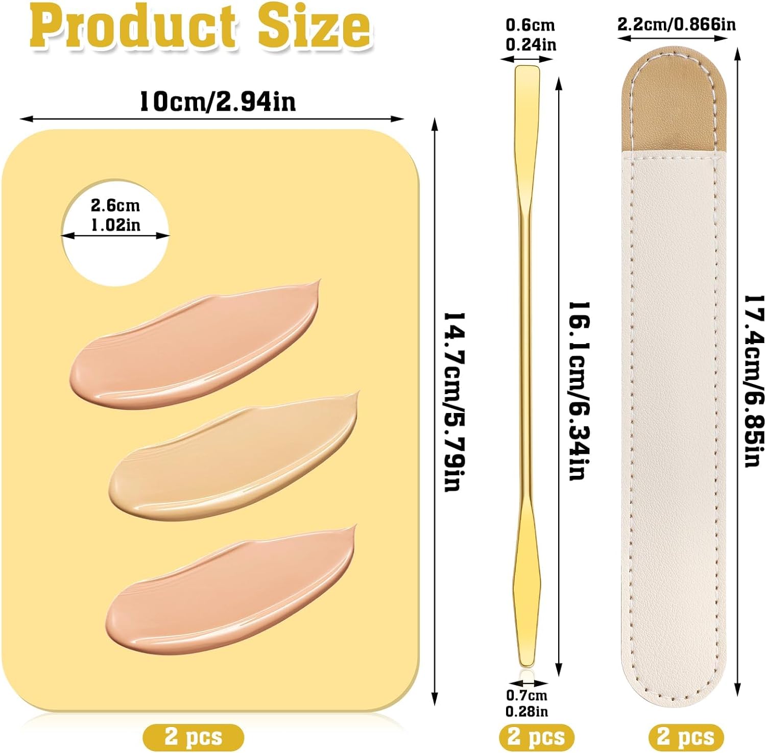 • 【Size Details】foundation tray: 3.94x5.79 inches/10x14.7cm, korean makeup spatula: 6.34 inches/16.1cm, leather case: 17.4x2.2cm/6.85x0.866 inches, small and exquisite.