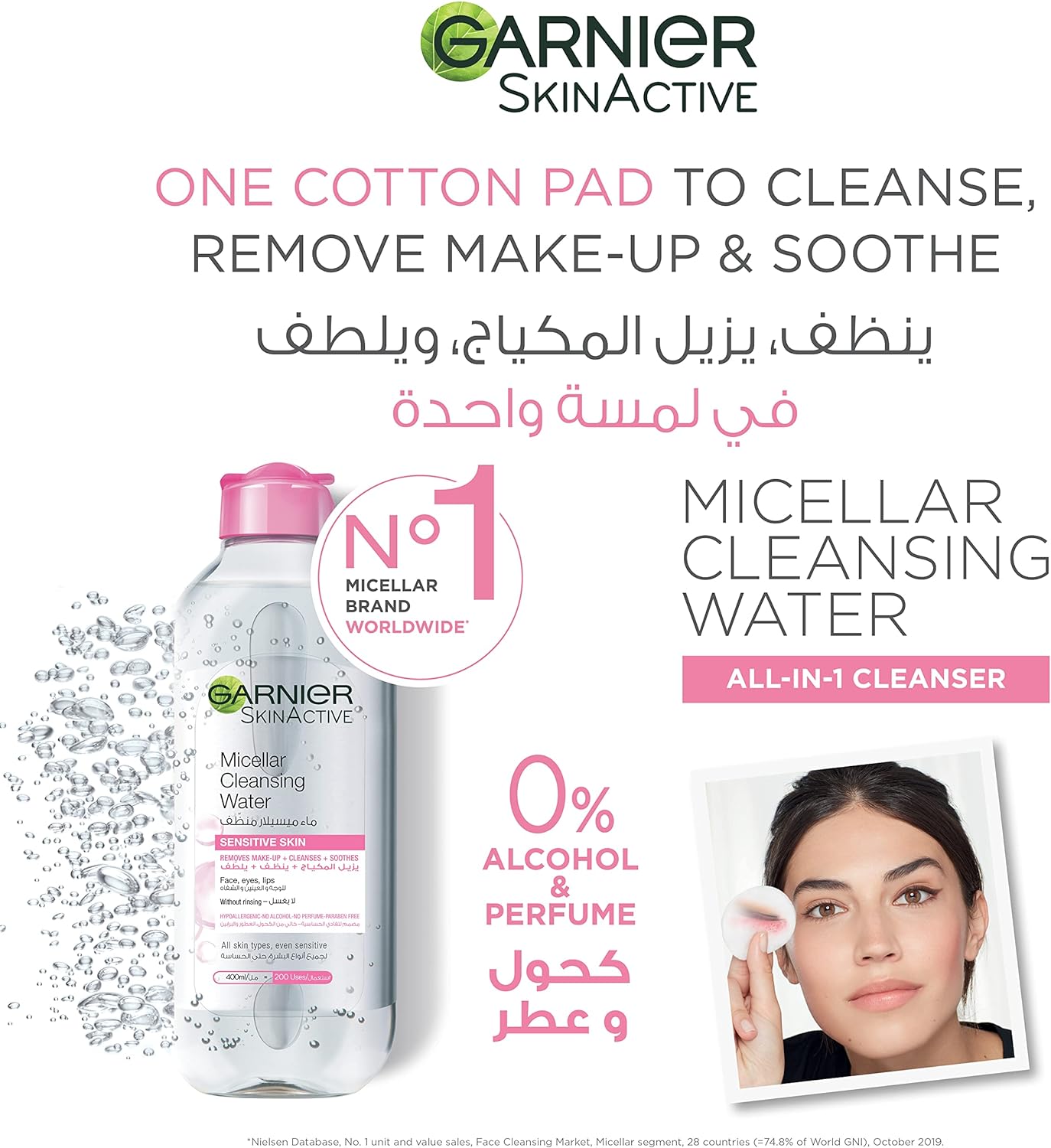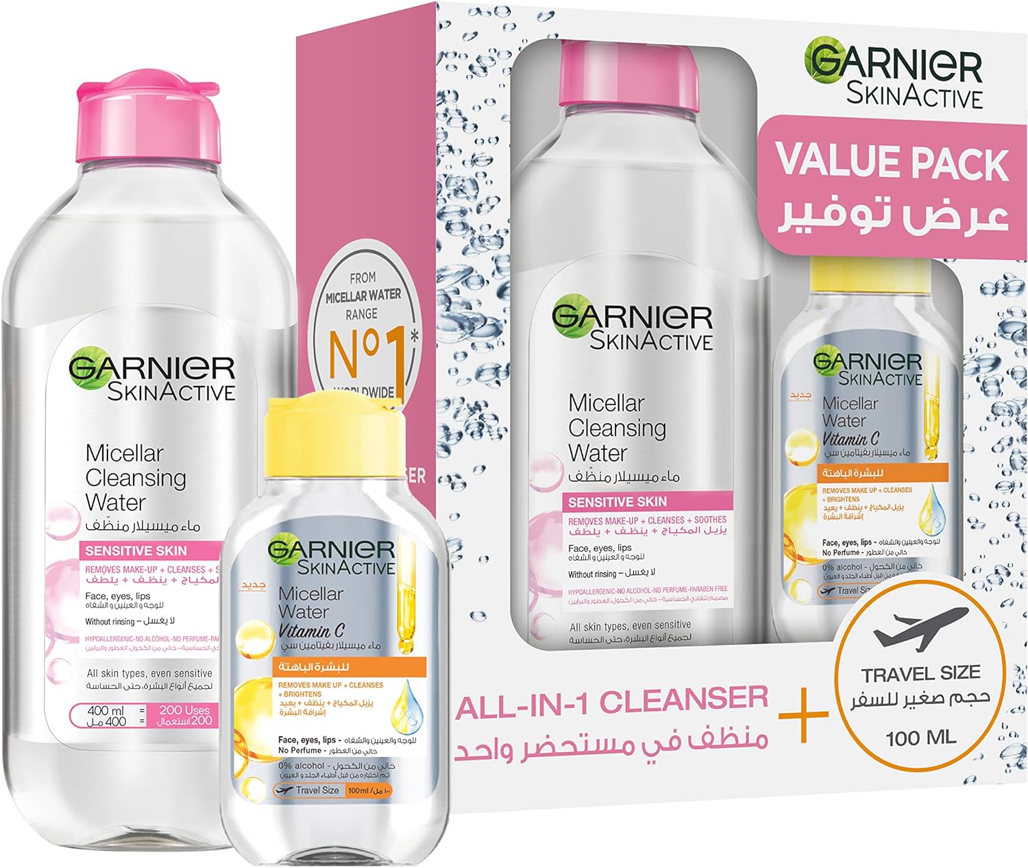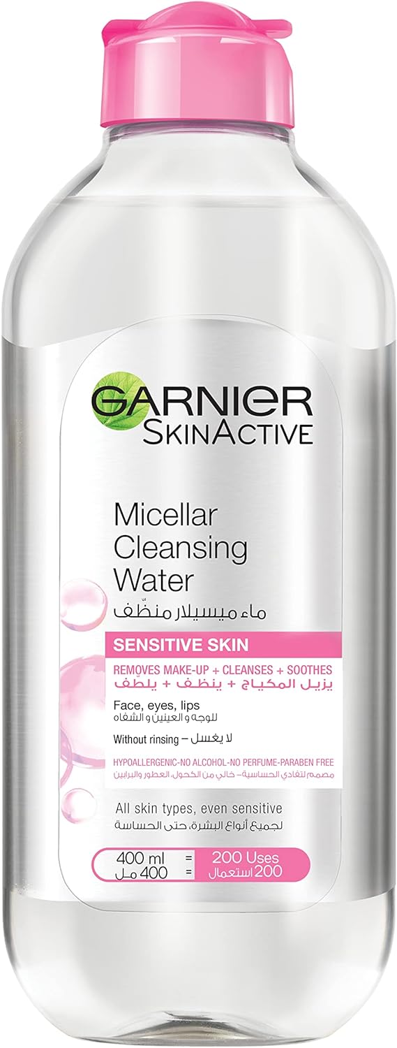 This Kit Contains: 1- Micellar Cleansing Water Classic 400ml 2- Micellar Cleansing Water Bright 100ml, your travel size solution The all-in-one cleanser for your face, eyes, and lips: Removes Daily Make-Up + Cleanses + Soothes all face areas with one cotton pad. For all skin types, even sensitive. Dermatologically and ophthalmologically tested No more need to rub: Garnier introduces the Micellar technology. It is formulated with micelles which capture dirt, sebum, pollution and everyday make-up from your skin like magnets in one gesture. Result: Skin is perfectly cleansed and refreshed.
