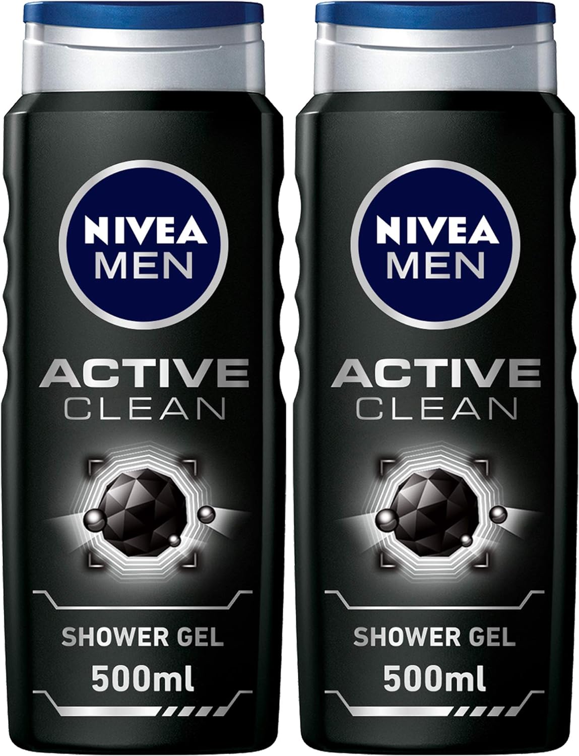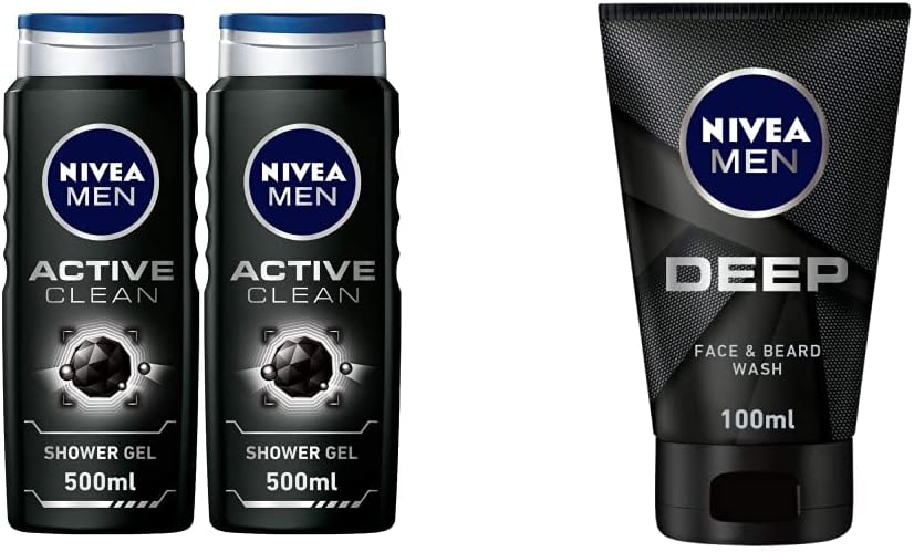 NIVEA MEN 3in1 Shower Gel Body Wash, Cleansing Active Clean Charcoal Woody Scent, 2x500ml