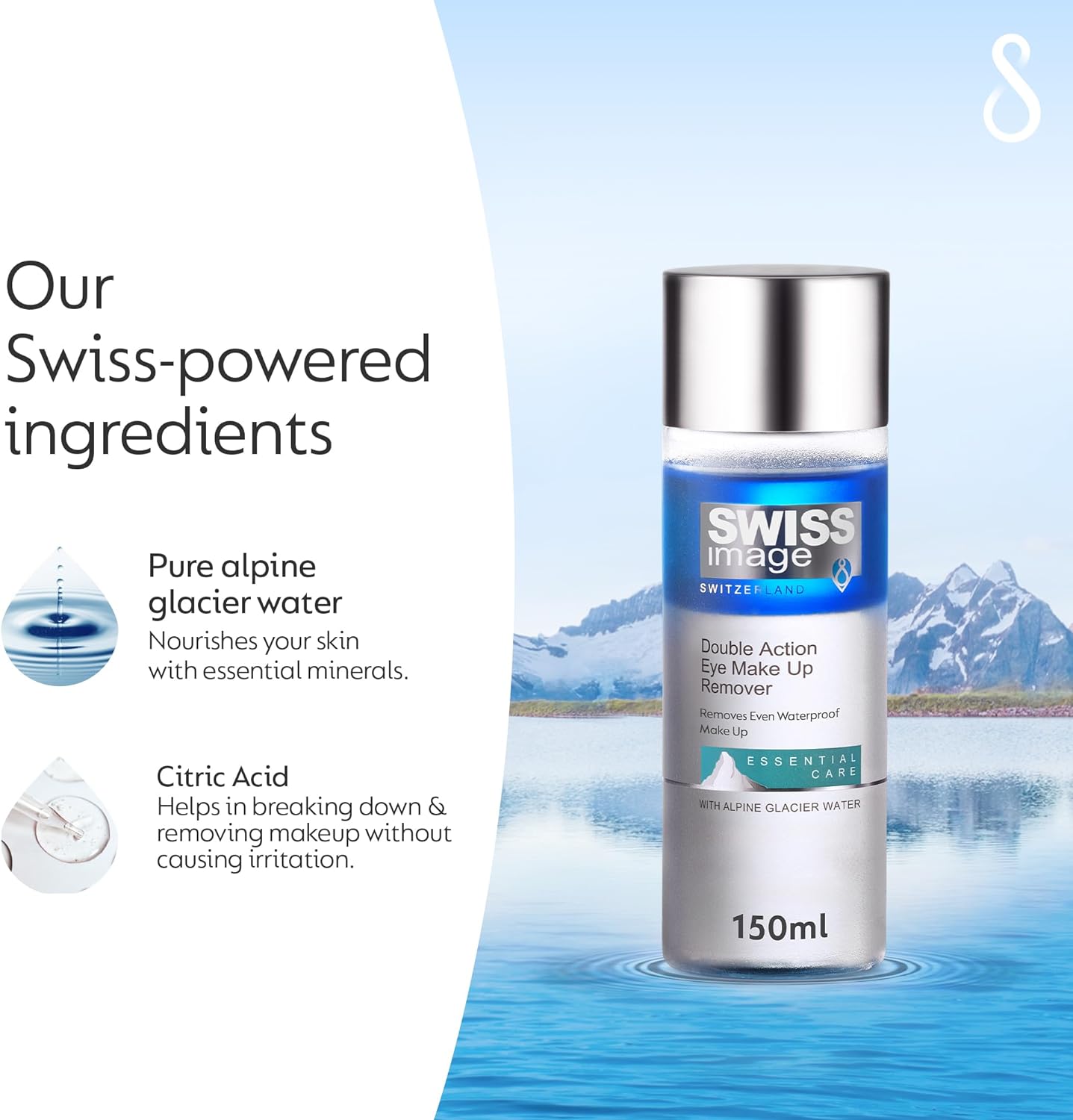 Swiss Image presents a range of innovative and high-quality skin care solutions. Say goodbye to the struggles of removing eye makeup, and pamper your delicate eye area with the Swiss Image Double Action Eye Make-up Remover. This eye makeup remover is specially made to help you to remove the eye makeup with ease, as it effectively removes all traces of makeup effortlessly even waterproof makeup. The oil phase of the product effectively lifts off makeup, while the water phase helps to soothe and protect the delicate eyelashes without leaving any sticky residue. It is a gentle yet effective formula that can remove even the most stubborn eye makeup. This eye makeup is enriched with the goodness of Alpine Glacier water and Citric acid. The Alpine Glacier Water helps to nourish and soothe the delicate skin around your eyes. While citric acid helps to break down the makeup and remove it from the eye. Citric acid is also an antioxidant that can help to protect your skin from environmental damage. All the products are made with melted water from the Swiss Alpine Glaciers along with ingredients from one of the world’s purest environments.