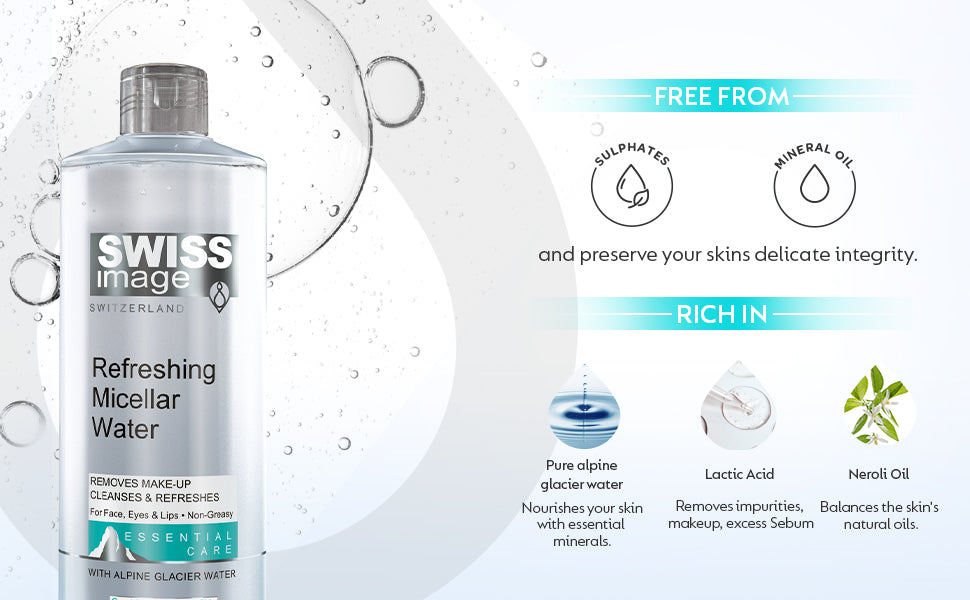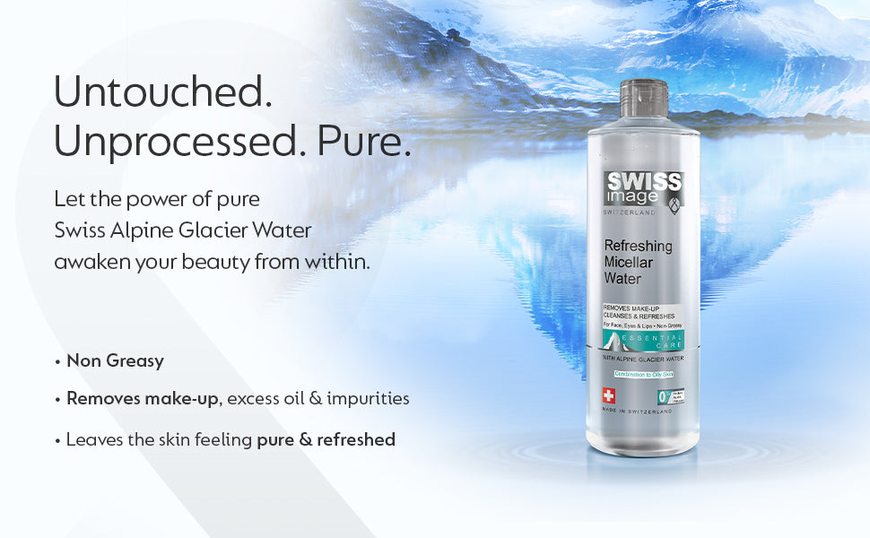 Get refreshed in a swipe with Swiss Image Refreshing Micellar Water. This ultimate refreshing Micellar Water is a perfect formula that cleanses, hydrates, and removes the makeup from the skin. This Micellar Water is a gentle and effective solution to remove makeup, dirt, and impurities from your skin. This is an effective micellar water for your face, eyes, and lips to remove daily makeup, cleanse the skin, and hydrate the skin. It effectively removes excess sebum production and refreshes the skin. No rinsing and harsh rubbing are required. This Micellar Water is enriched with alpine glacier water, Centaurea Cyanus Flower Extract, and citric acid, which are known for their amazing skincare benefits. Alpine glacier water contains a unique blend of minerals that help to hydrate and nourish the skin, leaving it feeling fresh and revitalized. While the Centaurea Cyanus Flower Extract gently refreshes and revitalizes the skin. Citric acid is a gentle exfoliating agent that helps to brighten the skin, leaving it looking radiant and glowing. Swiss Image presents a range of innovative and high-quality skin care solutions. All the products are made with melted water from the Swiss Alpine Glaciers along with ingredients from one of the world’s purest environments. How to use : Shake well and apply on your face using the cotton pads. No rinsing is required.