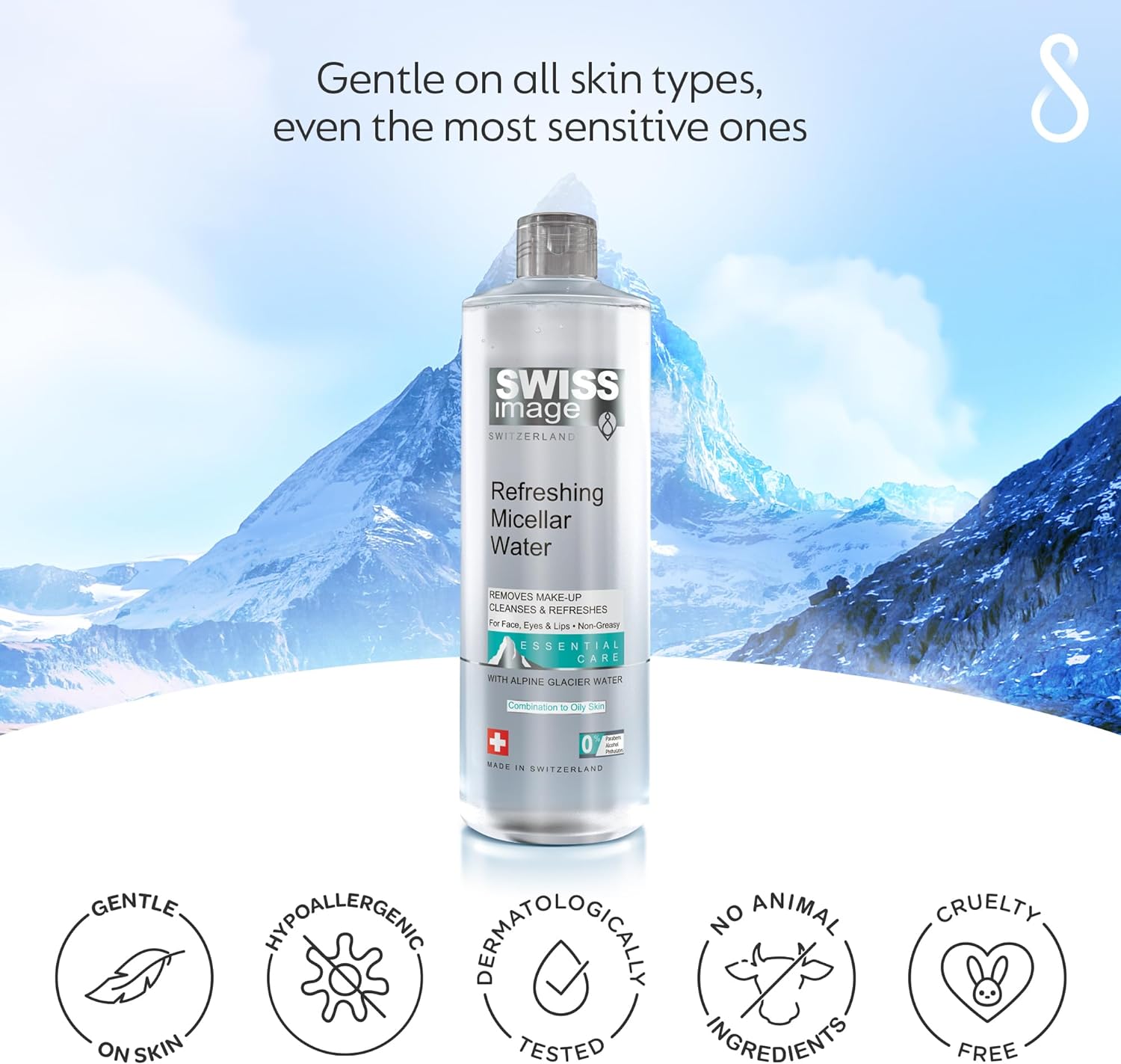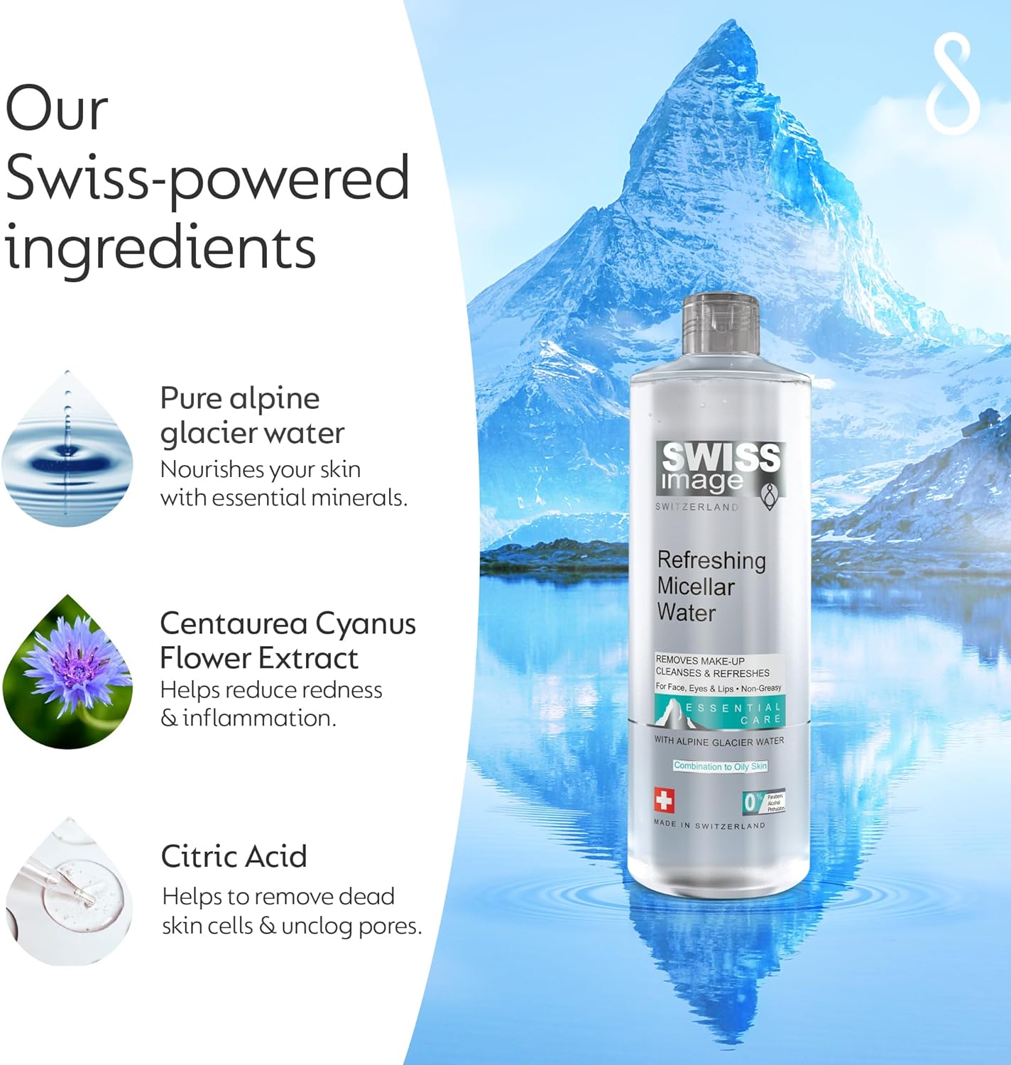 Swiss Image Essential Care Refreshing Micellar Water 400 ml | Removes Makeup, Cleanses And Refreshes | Micellar Water Makeup Remover For Face, Eyes and Lips | Non-greasy
