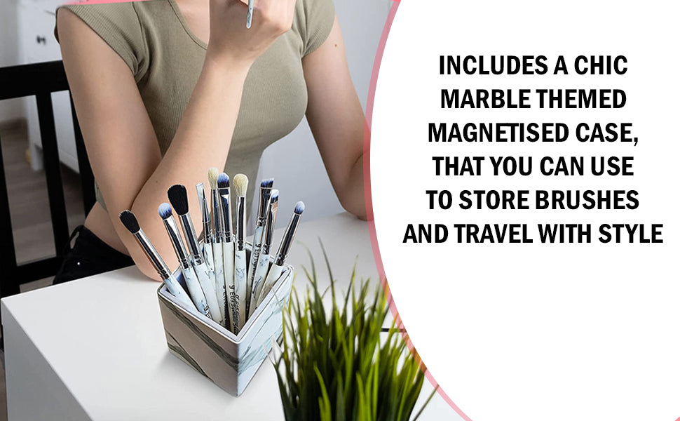 Packaging case: Perfect Eye brushes set to create perfect smoky eyes or any eye make up look, enclosed in a chic Marble themed magnetized case that can be used to store brushes.
