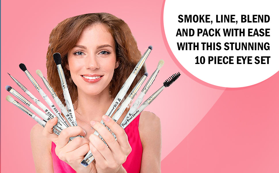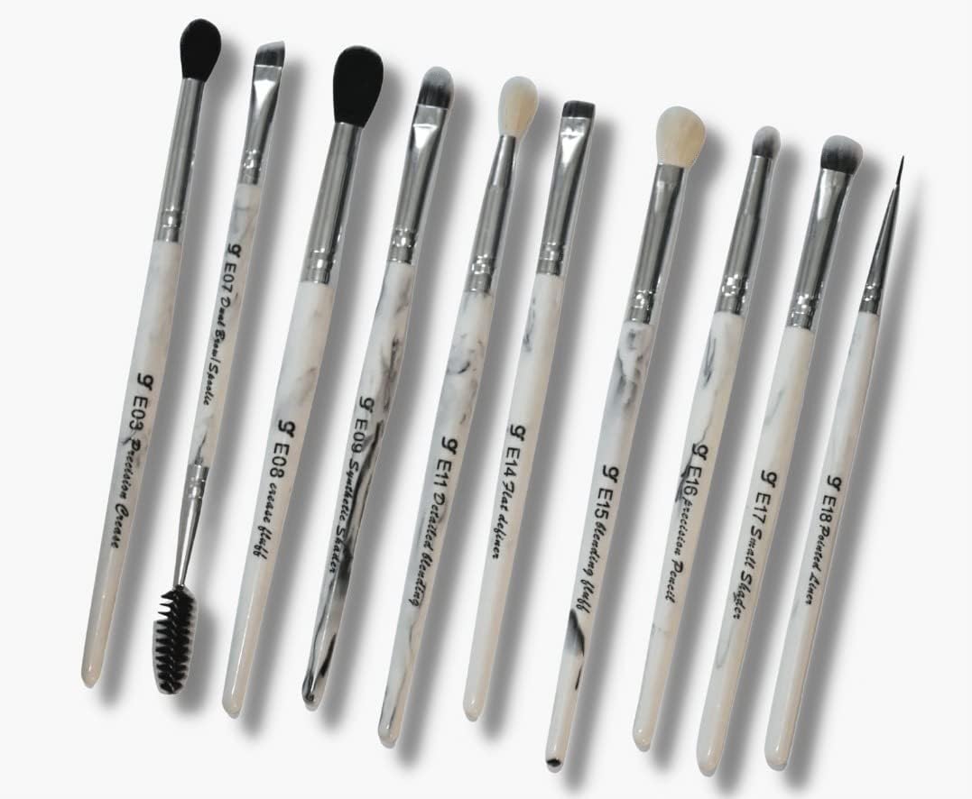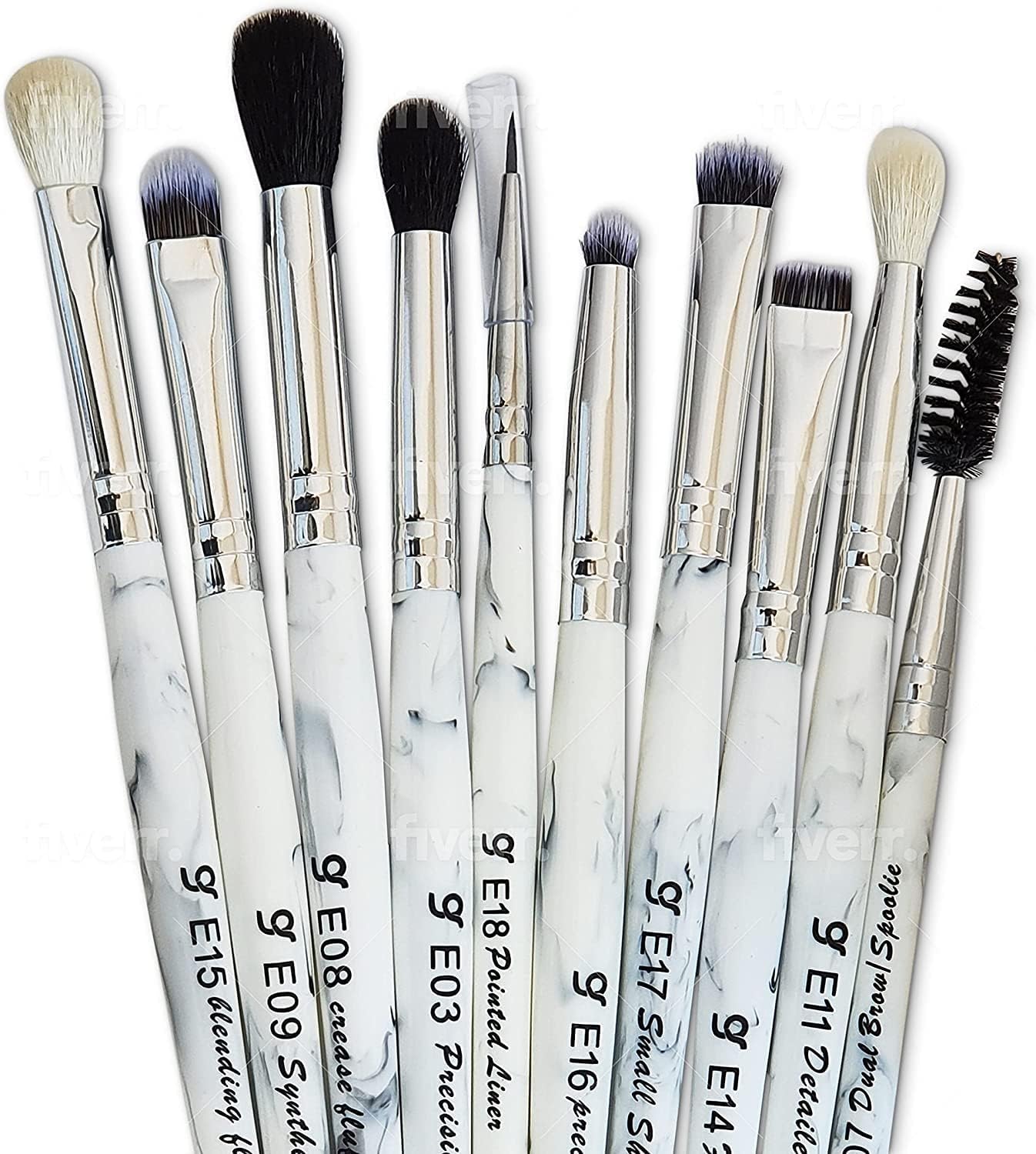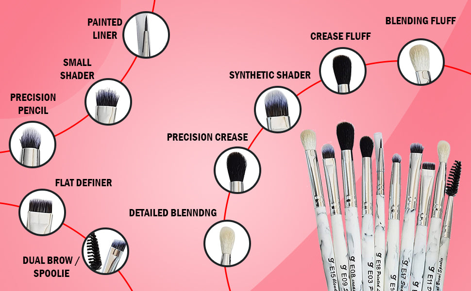 10 pcs Eye Brush Set:This set is comprised of eye make up brushes including: E03 (Precision Crease ),E07(Dual Brow / Spoolie),E08(Crease Fluff ),E09 (Synthetic Shader),E11(Detailed blending),E14(Flat definer) ,E15 (Blending fluff) ,E16(Precision Pencil) ,E17 (Small Shader) and E18(Pointed Liner).