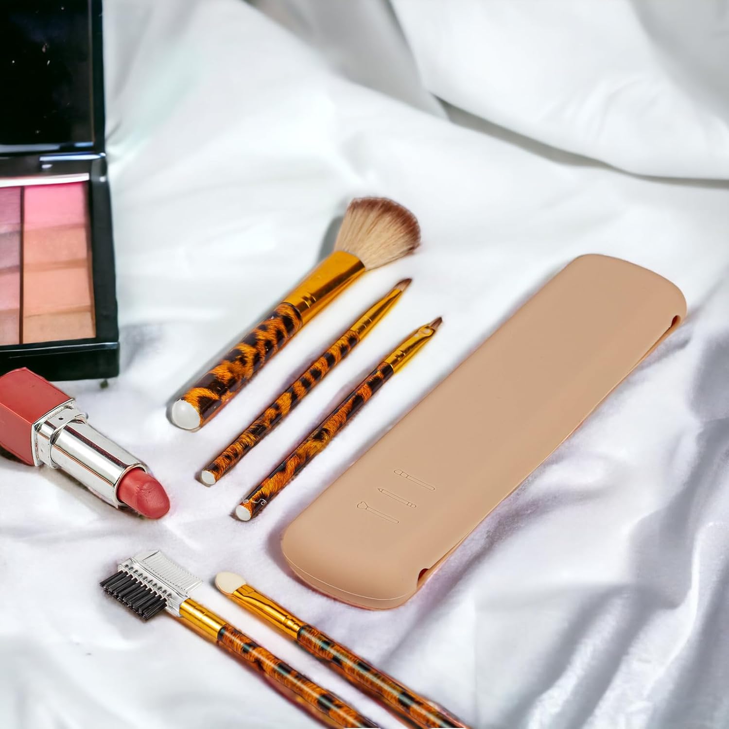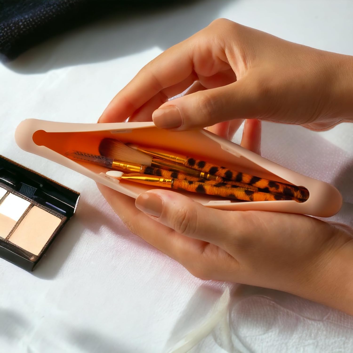 The travel makeup brush holder, a must-have accessory for every makeup enthusiast! This innovative product is crafted from high-quality silicone and boasts a large size, making it perfect for storing and organizing your precious makeup brushes. With the capacity to hold up to 3-4 brushes, this case ensures that your favorite tools are always within reach. One of the standout features of this travel-friendly Makeup Brush Holder is its exceptional waterproof design. Made from premium silicone material, it offers reliable protection against water damage. Whether you accidentally spill water or liquid foundation on your vanity or prefer to clean your brushes using water, this holder will keep your brushes safe and dry. Maintaining cleanliness and hygiene is effortless with this Makeup Brush Holder. Its smooth and non-porous surface can be easily cleaned using a bar of gentle soap and water. Unlike traditional brush holders prone to accumulating dirt and bacteria, this silicone holder can be thoroughly sanitized, ensuring your brushes stay pristine. Equipped with a secure magnetic closure, this Makeup Brush Holder protects your brushes. The strong magnets ensure the holder stays closed, preventing your brushes and other tools from accidentally falling out, even when you're on the go. This feature is convenient for travelers, allowing you to carry your brushes without worrying about damage or loss. Portability is a vital advantage of the Makeup Brush Holder. Its compact size and lightweight construction make it the perfect companion for your everyday makeup routine, as well as for travel purposes. Slip it into your handbag, or suitcase, and you'll always have your brushes organized and readily accessible, no matter where you are. The makeup brush silicone case also doubles as an exquisite and thoughtful gift. Its elegant, sleek design and practical functionality make it an ideal present for mothers, girlfriends, and friends.