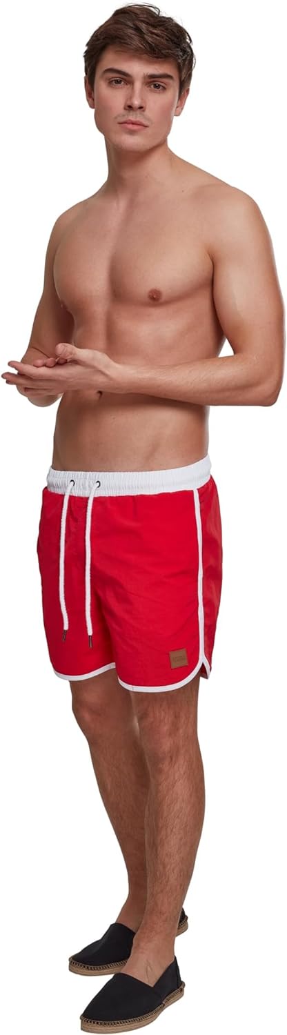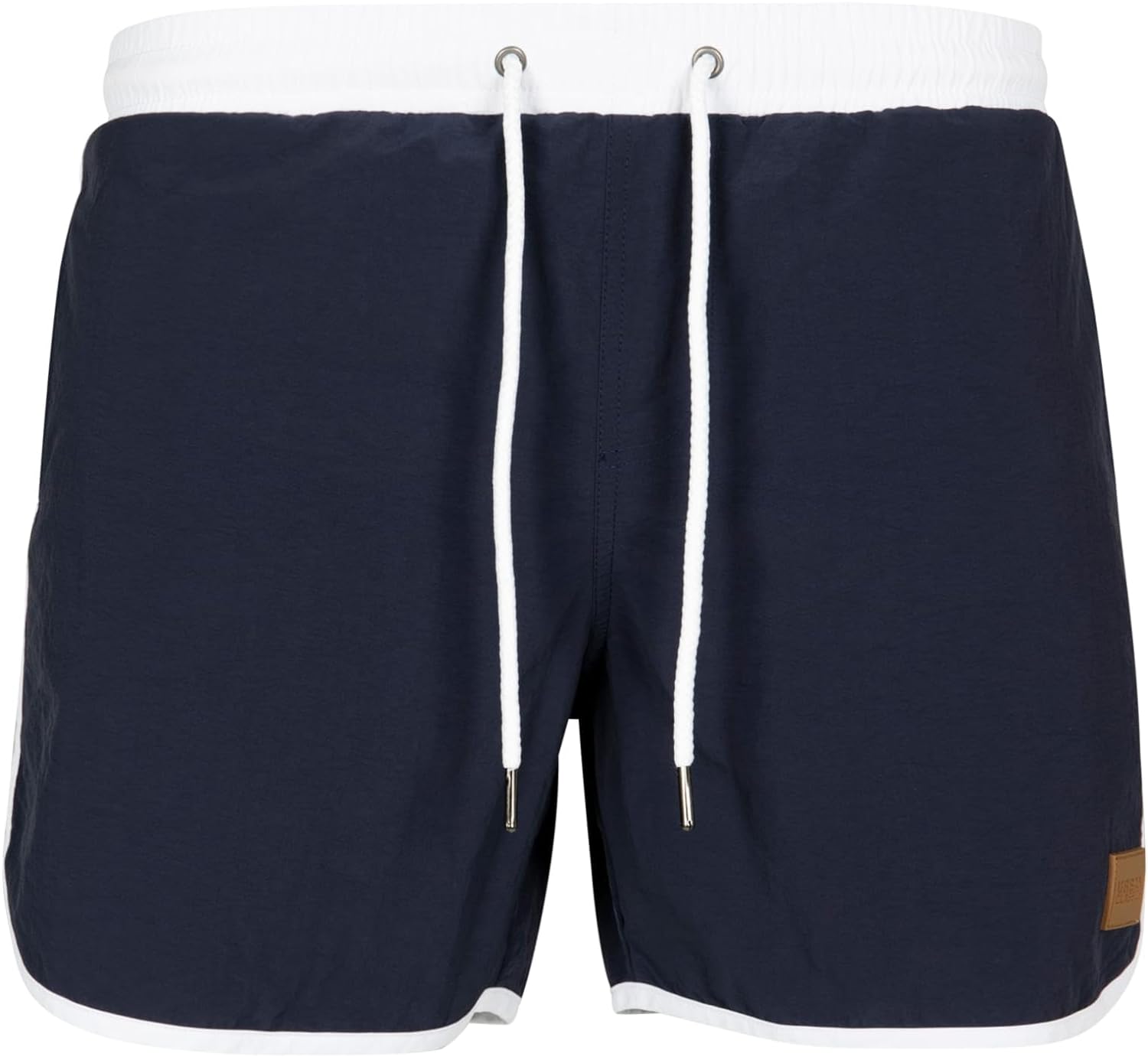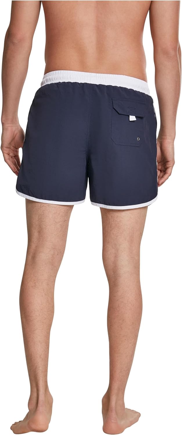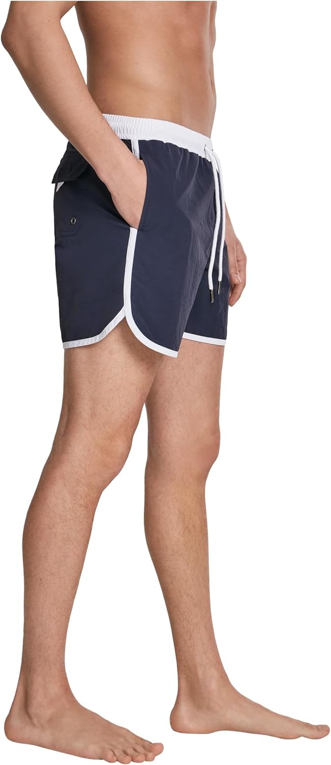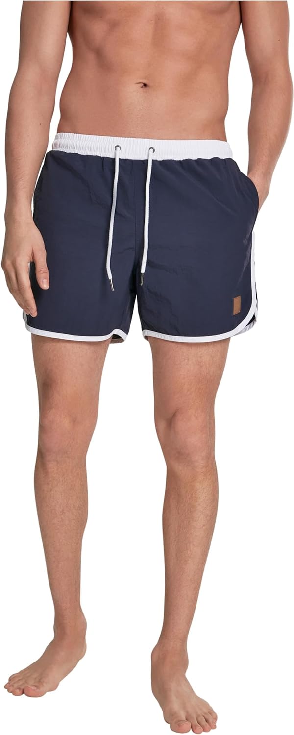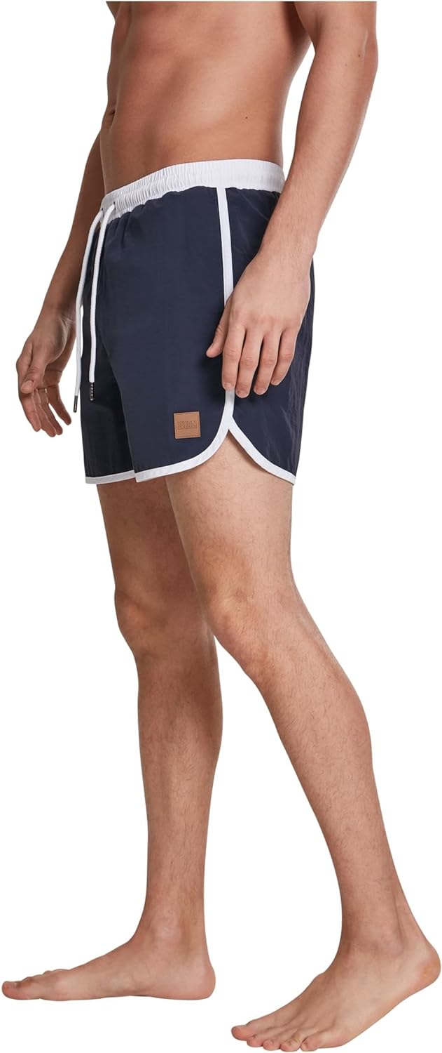 With a beautiful touch of retro to the pool. Classic sportswear design: the retro swim shorts from Urban Classics come authentic with a short fit, slightly rounded leg hem and white contrast piping as well as a white contrasting elastic waistband with drawstring. The lightweight nylon material, side pockets and a mesh insert ensure optimal comfort. The men's swimming trunks are available in black, red and navy blue, each with white contrasts in sizes XS (navy only), S, M, L, XL, XXL (all colours) as well as 3XL, 4XL and 5XL (black & navy). What size do I need? Size XS: length 35 cm / 1/2 hem 36 cm / 1/2 leg width (thigh) 33.5 cm. Size S: length 37 cm / 1/2 hem 38.5 cm / 1/2 leg width (thigh) 34.8 cm. Size M: length 39 cm / 1/2 hem 41 cm / 1/2 leg width (thigh) 36 cm Size L: length 41 cm / 1/2 hem 43.5 cm / 1/2 leg width (thigh) 37.3 cm. Size XL: length 43 cm / 1/2 hem 46 cm / 1/2 leg width (thigh) 38.5 cm. Size XXL: length 43.5 cm / 1/2 hem 49 cm / 1/2 leg width (thigh) 40 cm. Size 3XL: length 44 cm / 1/2 hem 52 cm / 1/2 leg width (thigh) 41.5 cm. Size 4XL: length 44.5 cm / 1/2 hem 55 cm / 1/2 leg width (thigh) 43 cm. Size 5XL: length 45 cm / 1/2 hem 58 cm / 1/2 leg width (thigh) 44.5 cm.