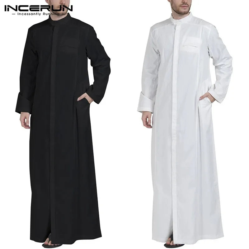 INCERUN Men Muslim Clothes Solid Color Jubba Thobe Long Sleeve Stand Collar Robes Dubai Middle East Men Islamic Arabic Kaftan