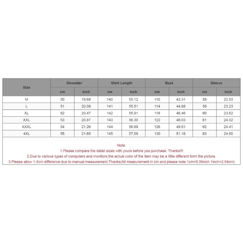 Size:XXXL Shoulder:54cm(21.26inch) Bust:126cm(49.61inch) Sleeve:62cm(24.41inch)