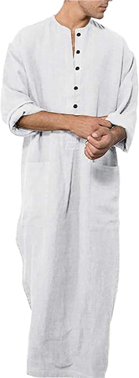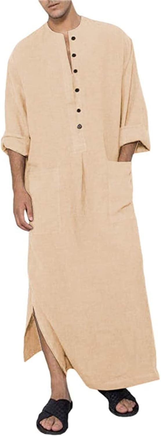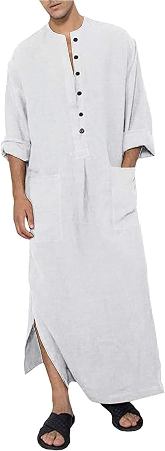 YAOHUOLE Men's Long Sleeve Robe Side Split Kaftan Thobe with Pockets Long Gown Button Up Casual Shirt