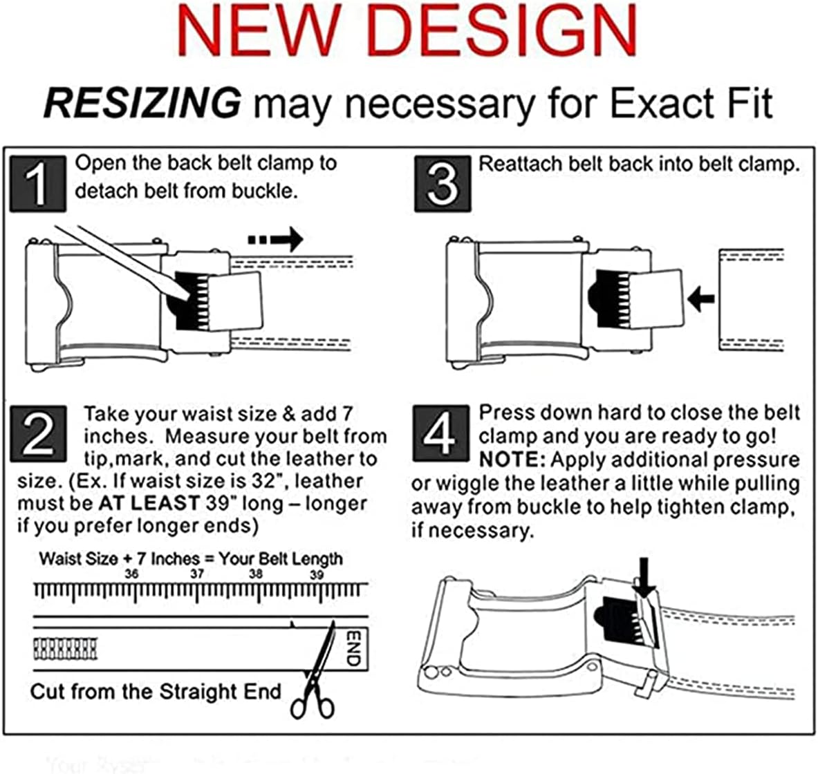 Perfect for jeans and pants in a leisure time Ideal to wear during walking or business trip Durable buckle We keeps improving metal material and structure to make the belt durable and firm in daily use. Rust-resistant, anti-corrosion and anti-scratch. Simple design Buckle can let the belt strap slide into fastly and will lock the strap tightly without trouble. If you lift up the lever at the side, the belt can be moved out and released. Simple but logical design makes the belt strap hardly slip off! Best Gift for Fathers or Sons Good collection of gift on Birthdays, Anniversaries, Valentine's Day, Father's Day, Labors day, Thanksgiving, other special occasions. Trim Instruction 1.Open the clasp with scissors. 2.Lift the clasp and take out the belt (detachable). 3.Cut the belt to your desired size and please be careful. 4.Reinsert the belt strap into the buckle and close the clas