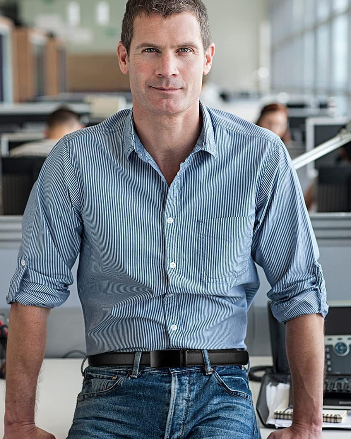 - 【QUALITY LEATHER】Elegant men's belt use bonded Leather and comfortable to wear. Soft, flexible and durable, strong and friction resistant. The belt is sleek and clean, match your casual outfits and business suits very well.