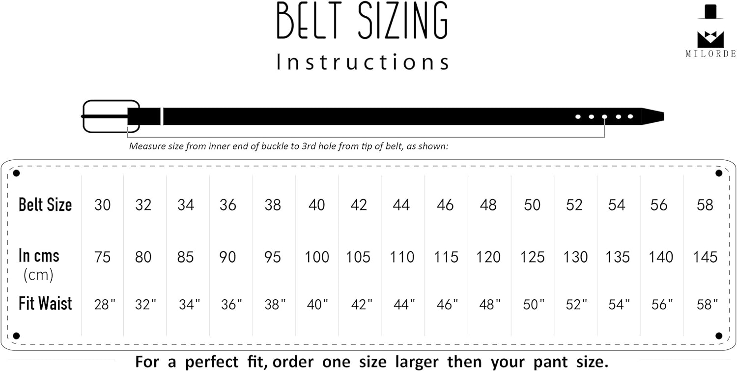 About: Milorde: is a highly experienced Manufacturer and creative Designer of more than 20 years, and provides a wide variety of high quality belts for men. One Goal to earn our customers’ respect via ✔Premium Quality✔Unique Design✔Valuable✔100% Satisfaction✔ Excellent Service Visual Features Milorde genuine leather men belts features a elegant design with a classic smooth finish and beautiful carefully crafted stitching on top & bottom, a single loop to hold end of strap with a single prong buckle. The variety of colors and sizes to choose makes the Milorde Belts complement for dressingwith any outfit to give you a sophisticated look and feel. Unique Design The Milorde leather belts styles, were carefully selected and designed by the world-class designers of men’s fine luxury goods, known for modern and upscale designs for men's clothing. The extraordinary beauty, durability and functionality meet your daily needs. Size Fits Well BE SURE TO ORDER SAME SIZE AS YOUR WAIST/PANTS SIZE. Please refer to the size chart in the last the image for the perfect fit. Belt size equals measurement in inches when measured from inner end of buckle to 3rd(the middle one out of 5 in total) hole. Awesome Gift Packaging We know the hassle of looking for that perfect gift, come valentine’s day gifts for him as well as Christmas, Father’s Day gifts, anniversary gifts, birthday gifts for men or just any lucky day. No more worries, he will loves our Milorde’s classic leather belts as well as our fashion gift packaging. Order with Milorde We sincerely serve you; promise 100% satisfaction for our customers and potentials. You can return or full refund in any time, no time limited. We are so sure and confident you'll love our leather belt. The difference is in detail.