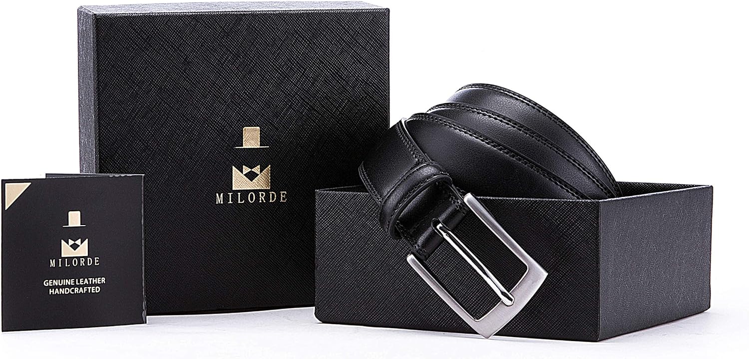 - GIFT PACKAGE: Our leather dress belt packed in a gift box.It's great as a present to surprise your friends,family and someone you love in any special days or anniversary..TRUST IN MILORDE Milorde's swift exchange policy enables you to purchase without hesitation 100% satisfaction guaranteed, no time limited exchange and return policy, so don't delay just add the Milorde Men's Classic Leather Belt to cart and enjoy your purchase