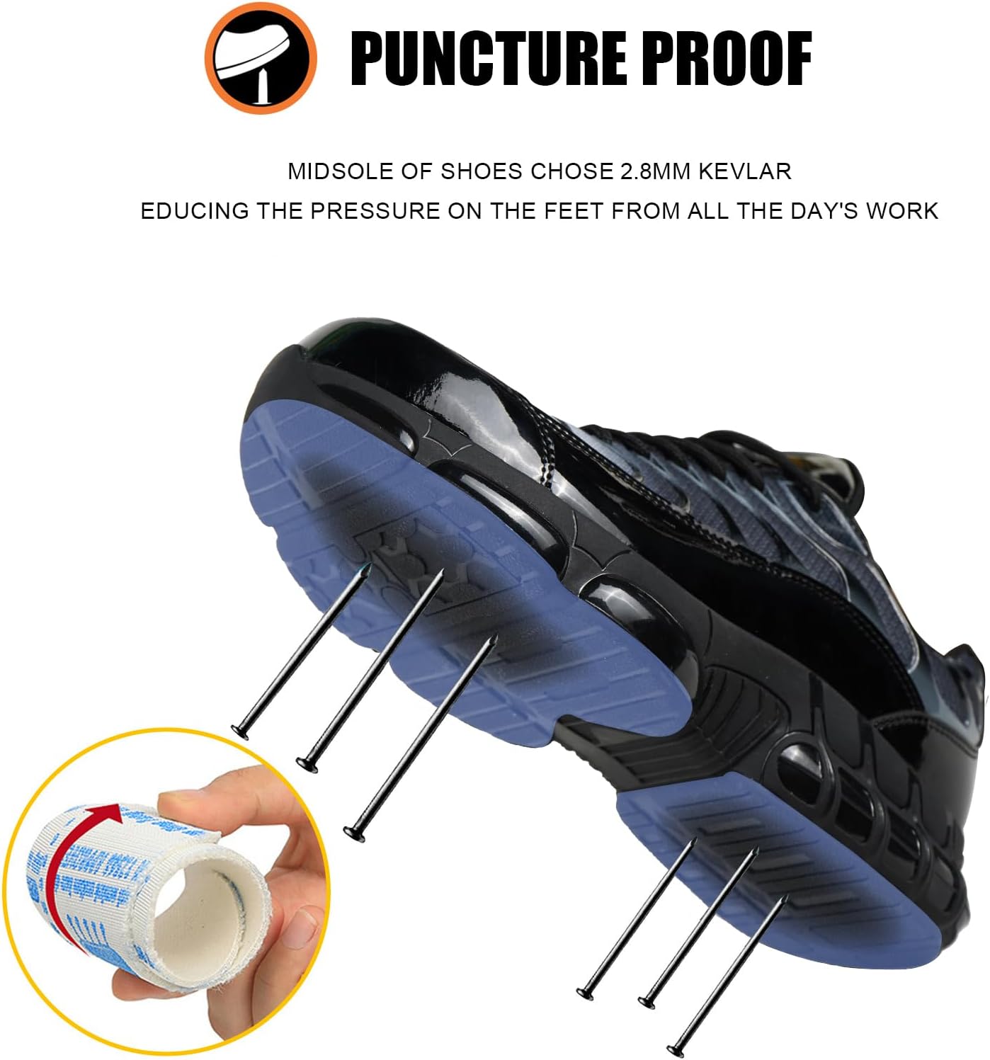 • 【💨 Air Cushion Shoes: Supportive Comfort】 These steel toe sneakers feature an air-cushioned design, delivering great foot support and shock absorption. The cushioning effectively relieves foot pressure, making these working indestructible shoes a comfortable choice for everyday wear. The air cushioning ensures that every worker can enjoy comfortable wear during daily tasks, reducing fatigue and enhancing productivity.