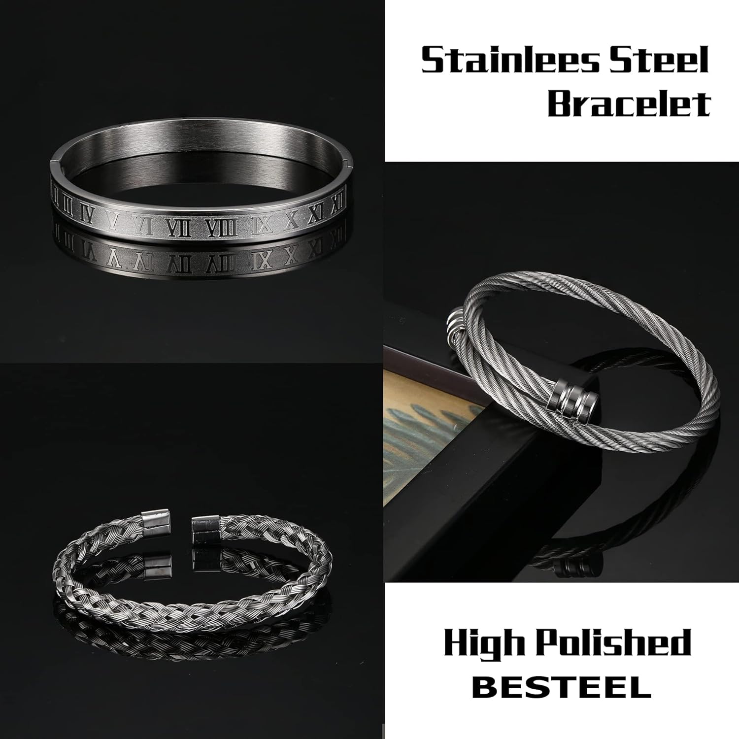BESTEEL 3Pcs Stainless Steel Bracelets for Men Roman Numeral Bangle Bracelet Adjustable Cuff Bracelet Twisted Cable Bracelet Mens Luxury Bracelets Jewelry Gifts Gold/Silver/Black