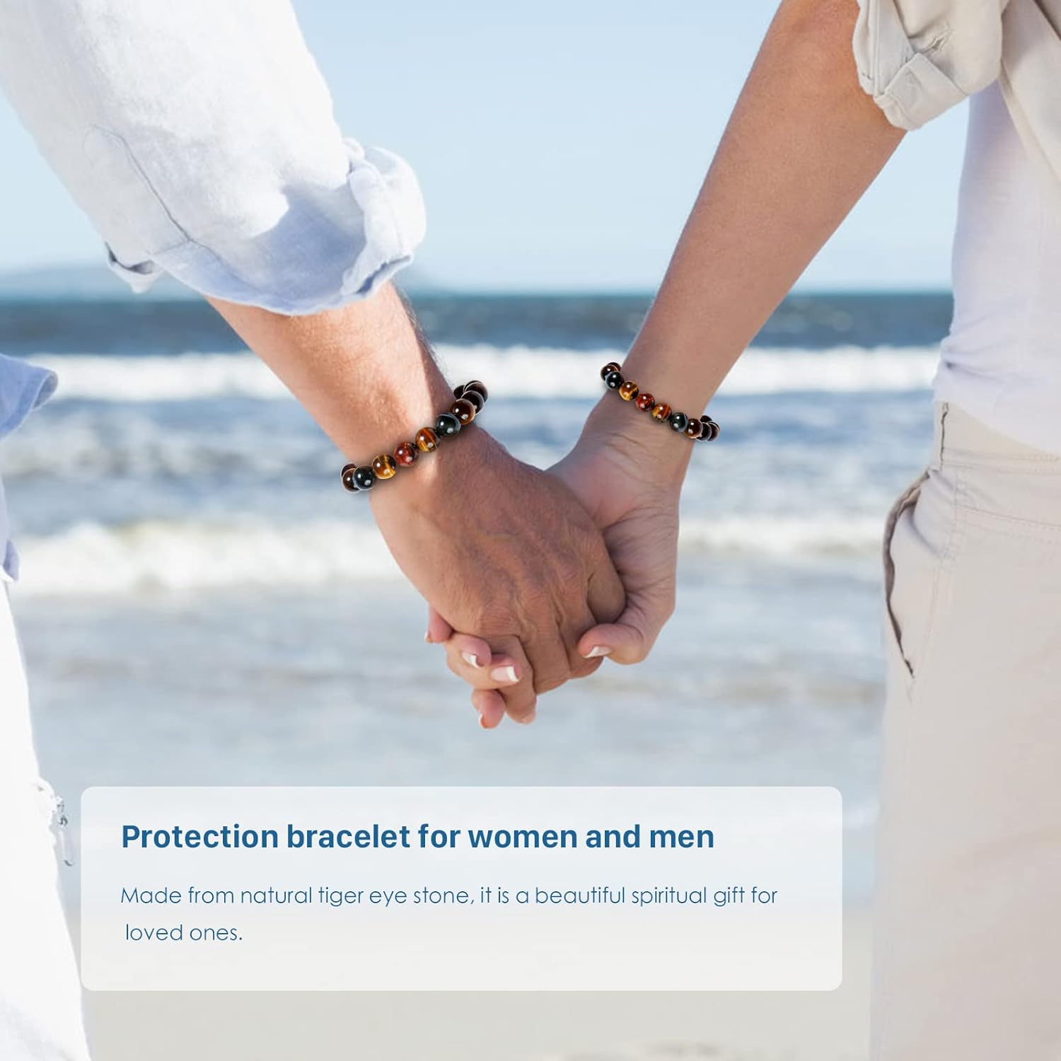 The Triple Protection Bracelet is made of natural tiger's eye stone by hand cutting and polishing, so each string of bracelets has a little difference in texture, color, and size, and will not be the same. The natural tiger's eye stone is believed to resist evil, help hypnosis and deep meditation, enhance people's observation and insight, enhance overall balance and mood, Improve daily status and bring good luck. Our tiger's bracelet raw material ore from South Africa, after our choice, made the bracelet, the tiger eye effect is clear, there are some lightning effect, texture natural, as the light is displayed, it is like the tiger's Profound eyes. Chakra bracelet material comes from natural tiger's eye gemstone, it is inevitable that there is a small amount of small ice cracks, small pits,gray or brown wrap, which is due to the extrusion of the crustal movement, changes from the inside of the stone. Please feel relieved, through our strict pick, this will not affect the beauty of this tiger's bracelet.Natural gemstone help you get the best of the tiger energy, get confidence, and identify the belief from nature. 10mm bracelet, fits your wrist size:5.7-6.7inches, Suitable for most women/girls, can be perfect with an elegant or hippie dress. 12mm bracelet, fits your wrist size:6.0-7.2inches, bigger beads, stronger energy, Fit Most women/girls,Or men who don’t have a big wrist circumference. 14mm bracelet, fits your wrist size:6.1-7.7inches, suitable for most men. In addition to wearing yourself, this can also be given as a perfect gift to Christmas / New Year's Day.