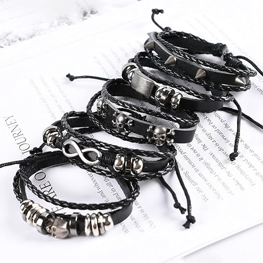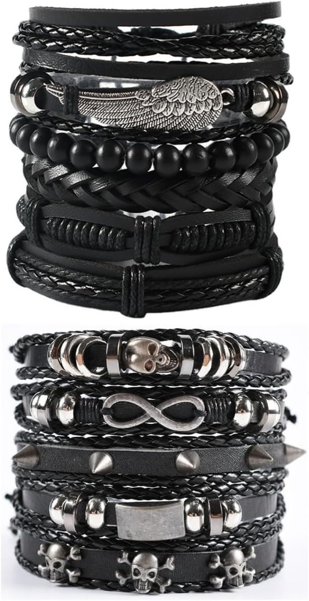 - Punk Leather Bracelets--2 Pack black leather bracelets one set, different handmade woven leather bracelets for men, women, you can wear it together or separately, you can also share it with your friends and family. Gothic skull bracelet, guitar bracelet, Music note bracelet, five-pointed star bracelet, multiple choice for you.