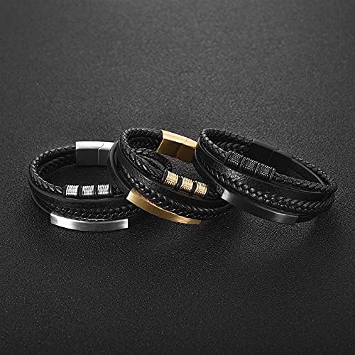 Goodern Mens Bracelets Multilayer Braided Leather Wristband Bangles Magnetic-Clasp Fashion Stainless Steel Chain Men Retro Male Braid Jewelry for Boys Best Gift Idea for Men Matching Bracelet 23CM