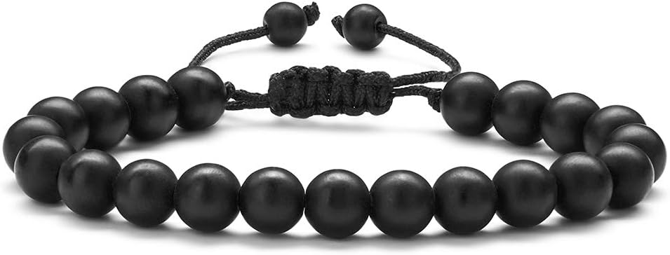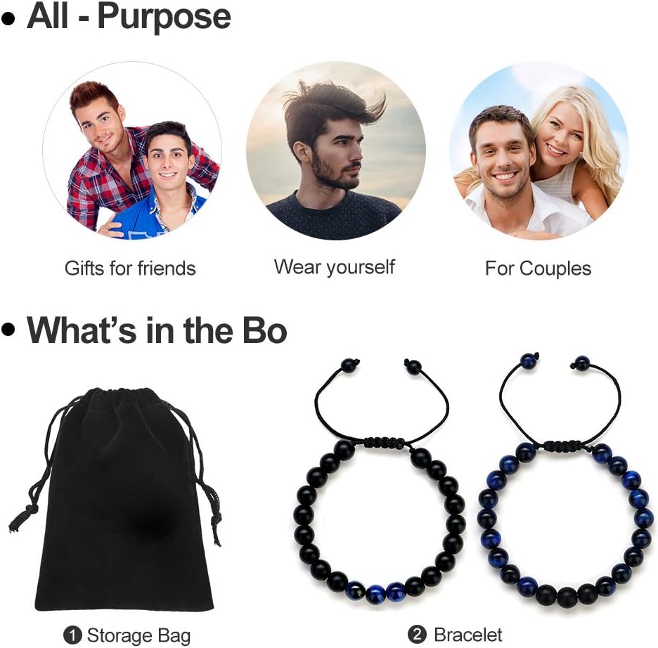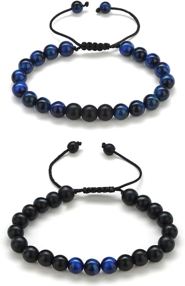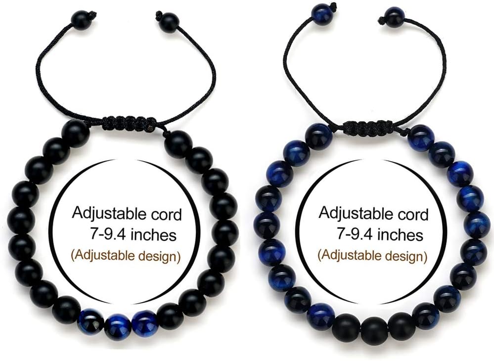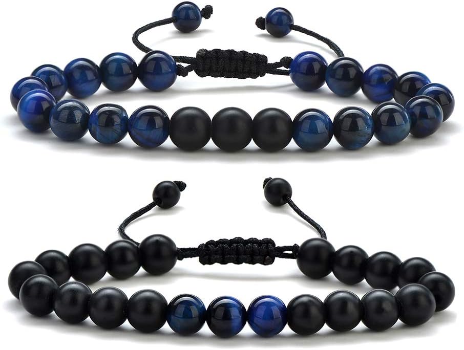 - MATERIAL: 2Pcs beaded bracelet with black braid cord (blue tiger eye, matte agate), 8mm natural stone, shiny and smooth. No metal, good for sensitive skin. Exquisite womens mens bracelets for everyday wear.