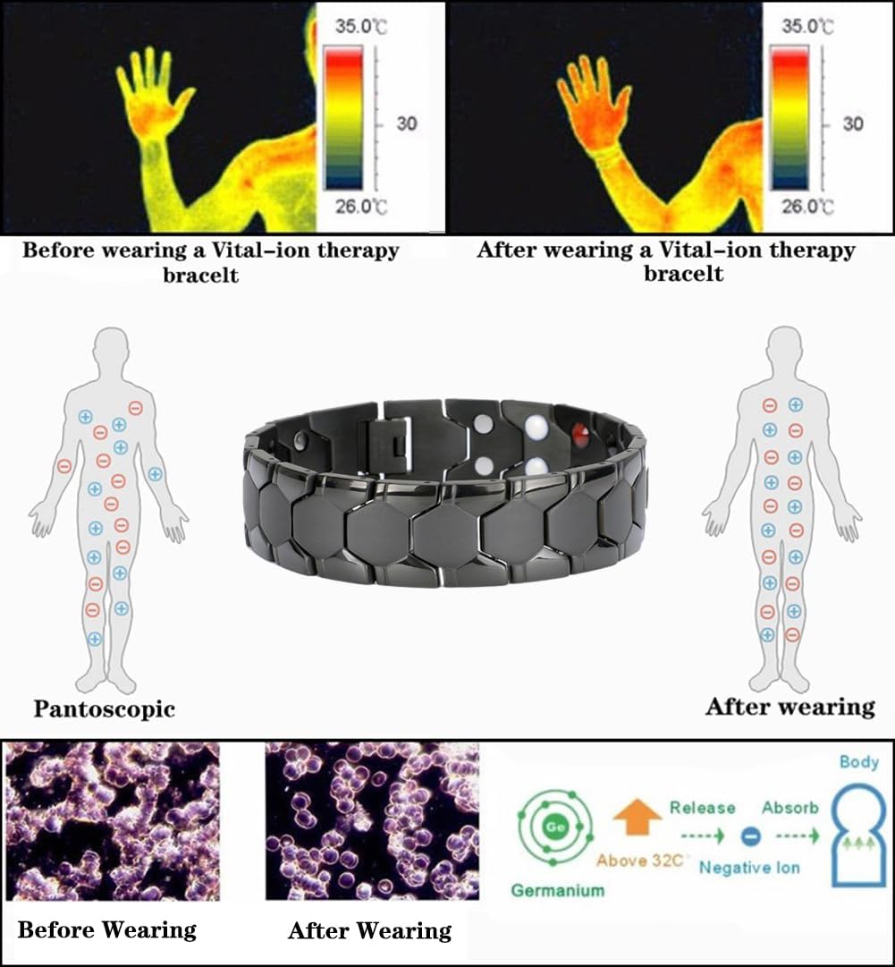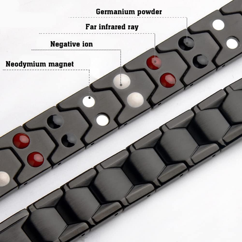 • Double-Row 4 Elements Bracelet - White: negative ion; Red: far infrared; Black: germanium; Steel: magnetic. Double-Row 36 pcs Energy Magnets embedded in the bracelet inner, wear on wrist help to balance energy.