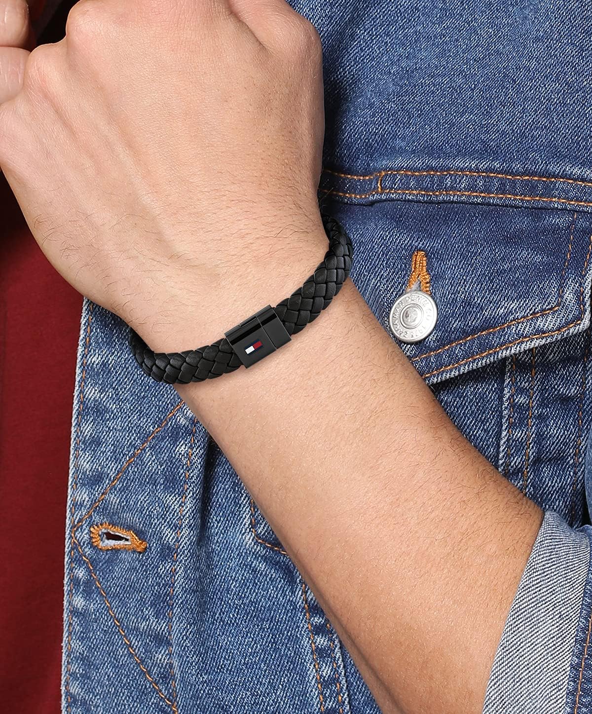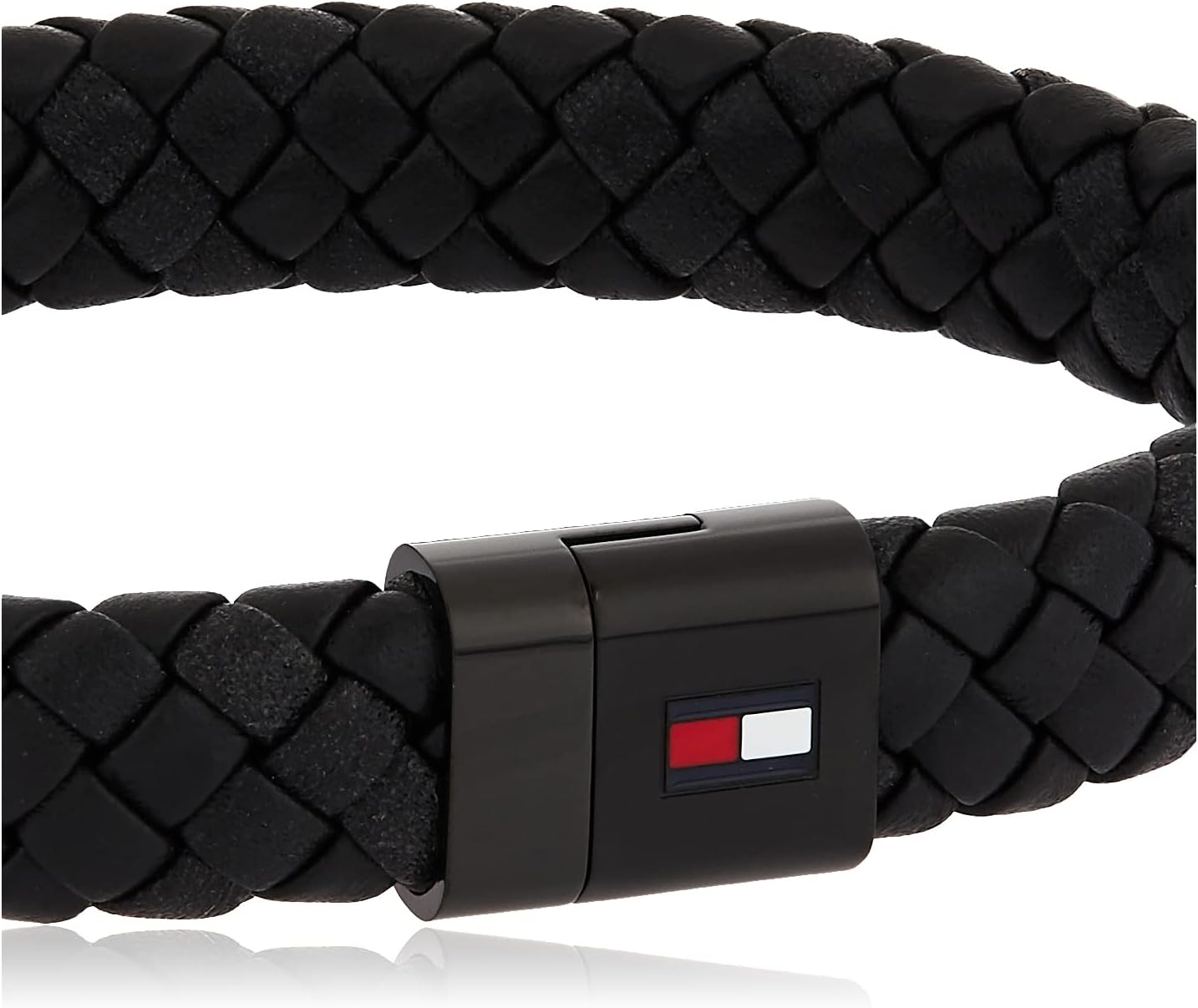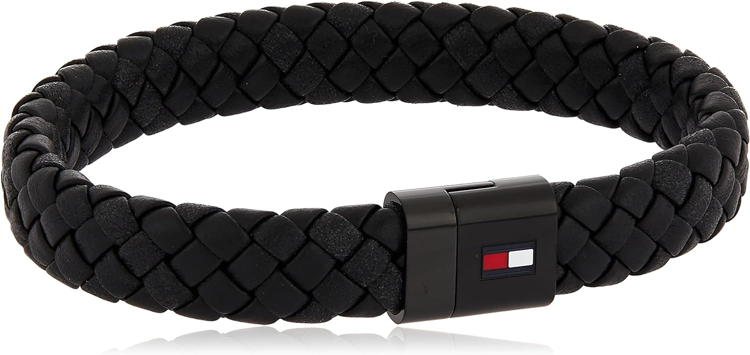 - Tommy Hilfiger Men's jewelry. Punch up your casual wardrobe with this braided leather bracelet, featuring a magnet closure and the signature-branded corporate stripe.