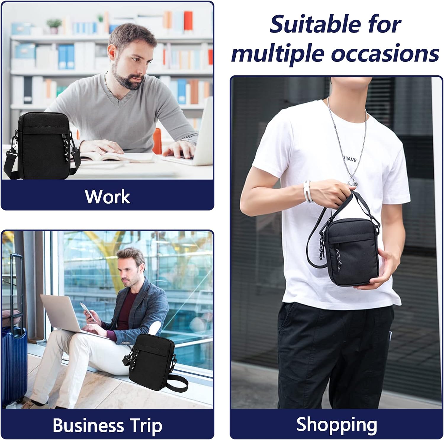 We designed this messenger bag for modern life. Perfect for business, outdoor sports, traveling, working, etc.The mini messenger shoulder cross body bag can well organized your carry-on essentials, such as credit cards, identity cards, coupons, tickets, key, money, coins, cash and etc.Specification:Color: blackNet Weight: 0.16kgMaterial: 900D oxford fabricPackage size: 20cm* 18cm* 2.5cmShoulder strap length up to 128cm, shortest is 66cmGender: man women shoulder bag cross body bagsWay for use: crossbody, messenger, shoulder, waist purse, luggage attachment.