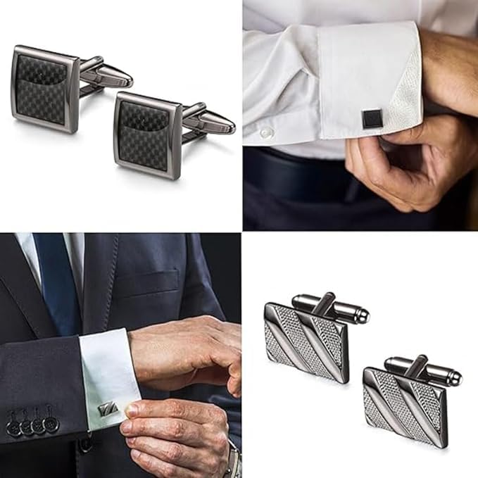 Men's Cufflinks: Perfect Design: *This Cuff Links And Shirt Stud Features Solid Brass And Excellent Color Plating.Stay Long-Time Color Retention *Unique Carbon Fiber Design, Stand Out But Not Too Gaudy,Add a Touch Of Contemporary To Your Outfit *Basic Round And Square Shape, Suitable For Every Occassion From Day To Day Work Days, Wedding Or a Night Out On The Town *Superb Craftsmanship,High Polished Mirror Shiny Finish.Looks Stunning *It Is An Ideal Gift For Any Time Of Year.Great For Daily Casual Wearing And Special Occasions As Well. Specifications: Material: Copper+Layers Of Stainless Steel Plating Color: Matte Black/Black/Silver Size: 0.71 Inch/0.59 Inch/0.63 Inch Package Included: Shirt Suit Cufflinks x 6 Pairs In Order To Let You Have a Happy Shopping Experience,We Have Done And Will Do As Follows: 1.Products We Sell Are All In New Condition And Finished Rigid Inspection. 2.If You Have Any Questions,Just Contact Us,We Will Do Our Best To Help You. 3.If You Received The Goods And Are Not Satisfied Our Products,We Promise 90-Day Guarantee.