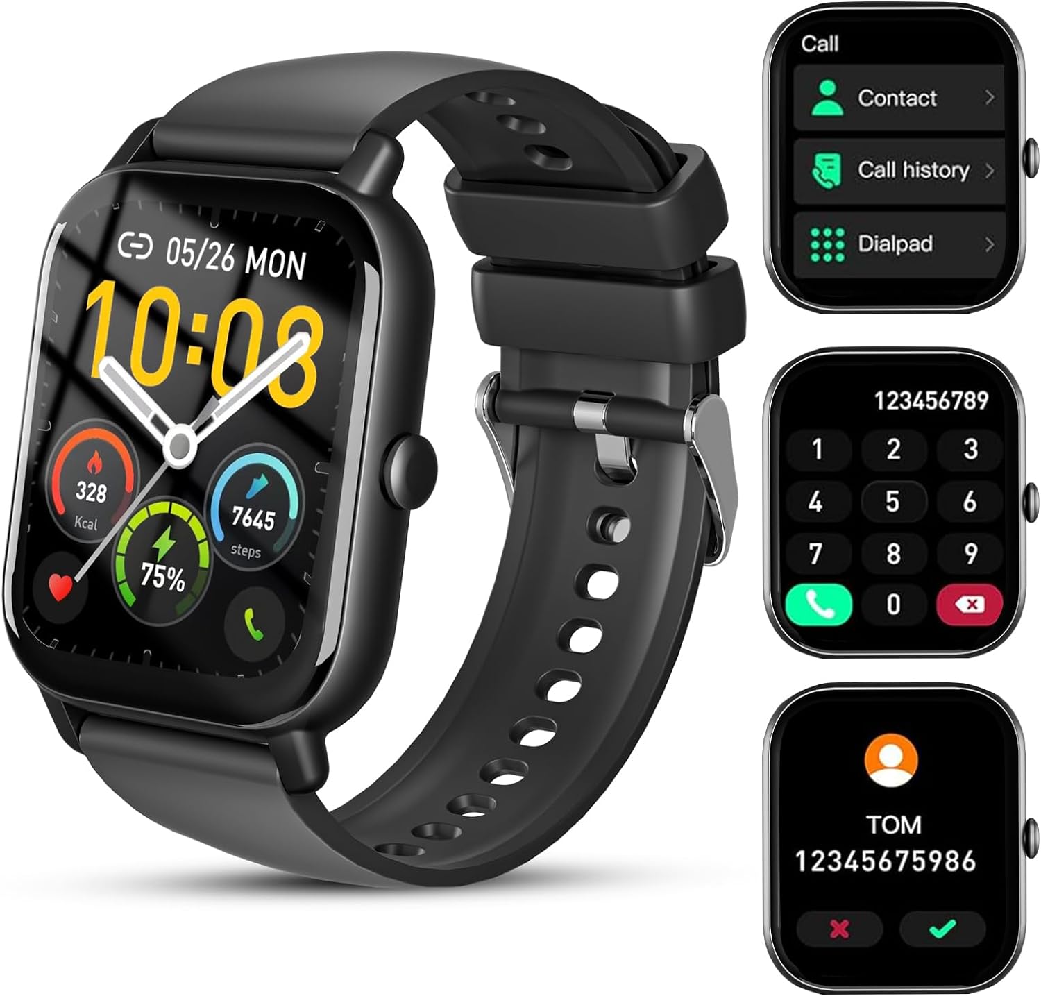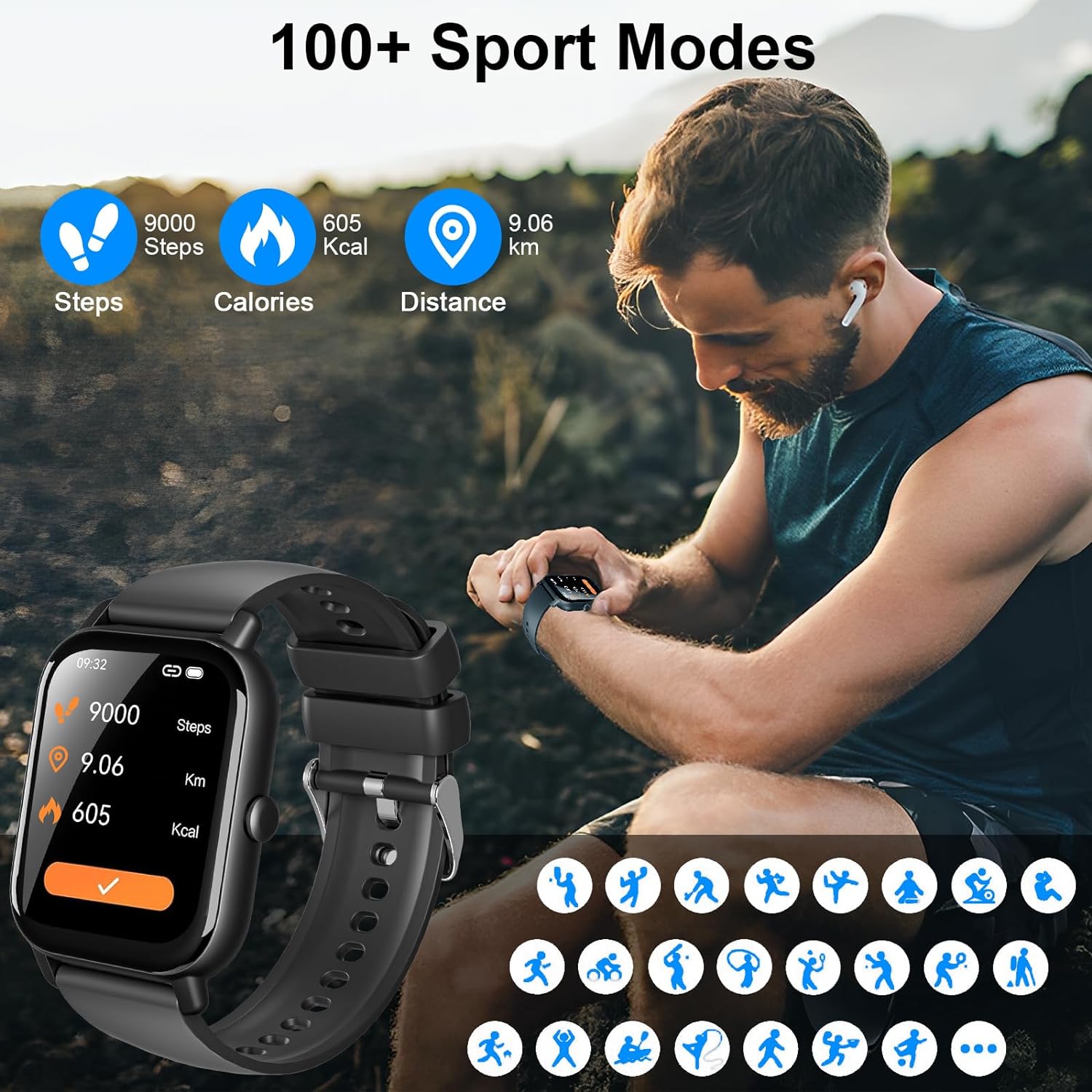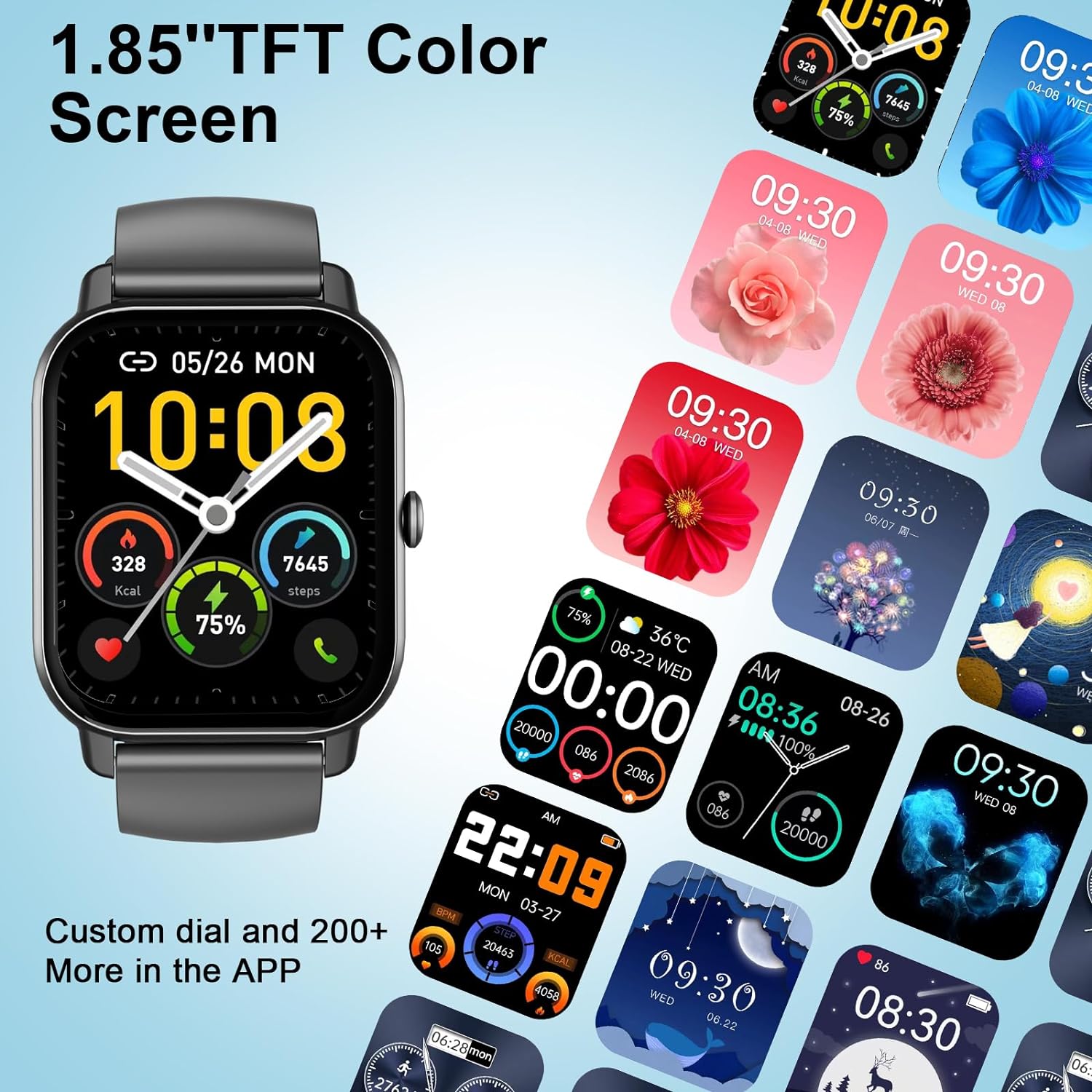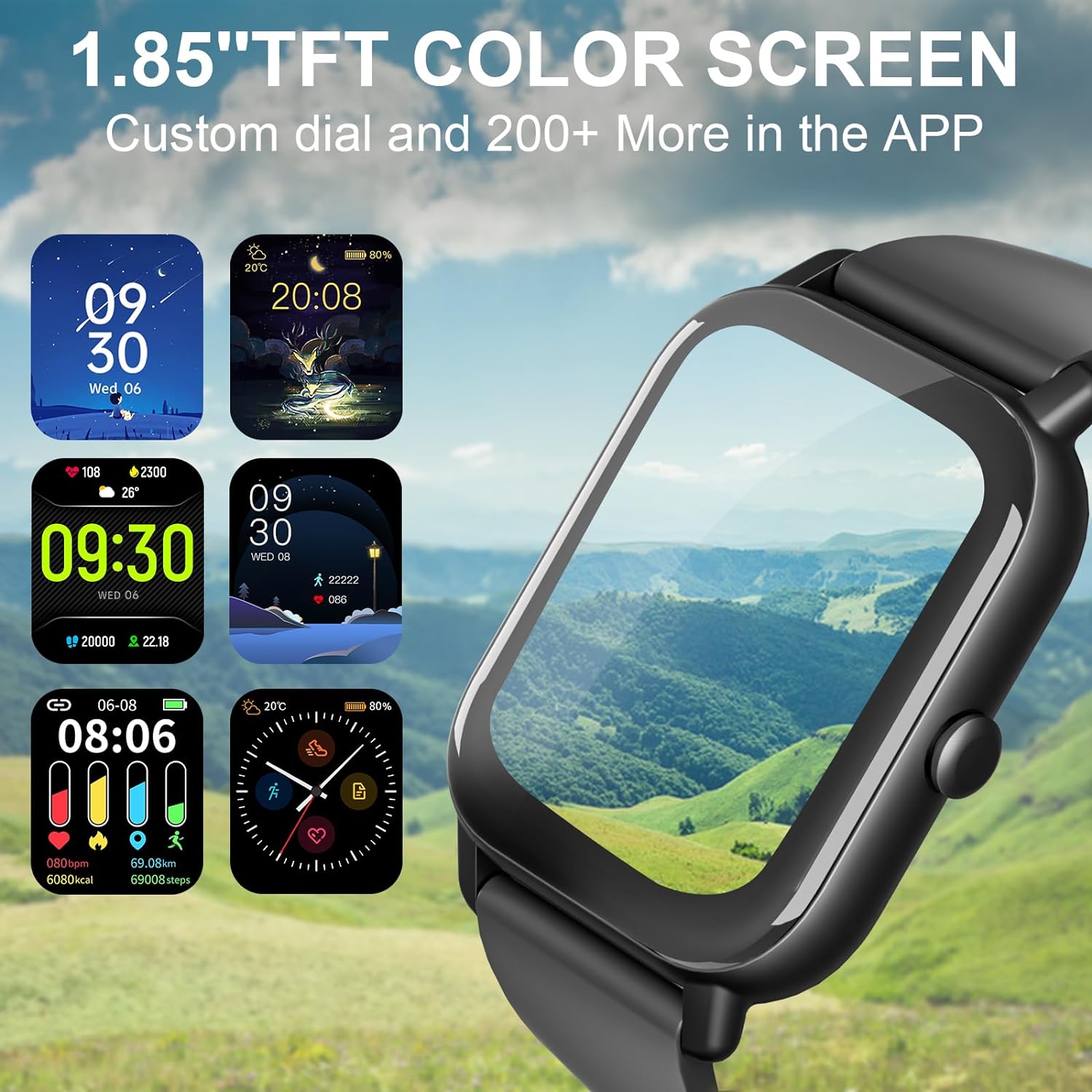 ⌚1.85'' HD Screen & 100+ Watch Faces - The smartwatch boasts a large 1.85-inch full touch color screen, delivering exceptional picture quality and highly responsive touch sensitivity, all while being resistant to scratches. With an extensive collection of over 100 watch faces to choose from, you can personalize your men's or women's watch by selecting your favorite photo as the dial.