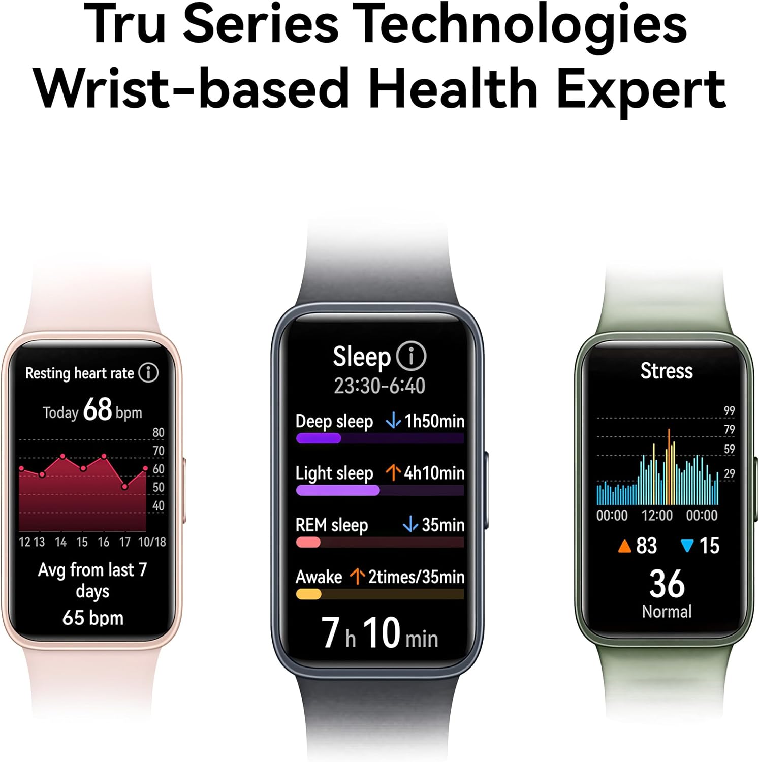 Tru Series Technologies Wrist-based Health Expert-TruSeenTM 5.0 support continual SpO2 and heart rate monitoring, TruRelax technology makes it easy to take it easy, with stress-busting breath exercises, HUAWEI Band 8 features a new and improved AI algorithm that tracks heart rate round the clock and tells you right away if something is abnormal.