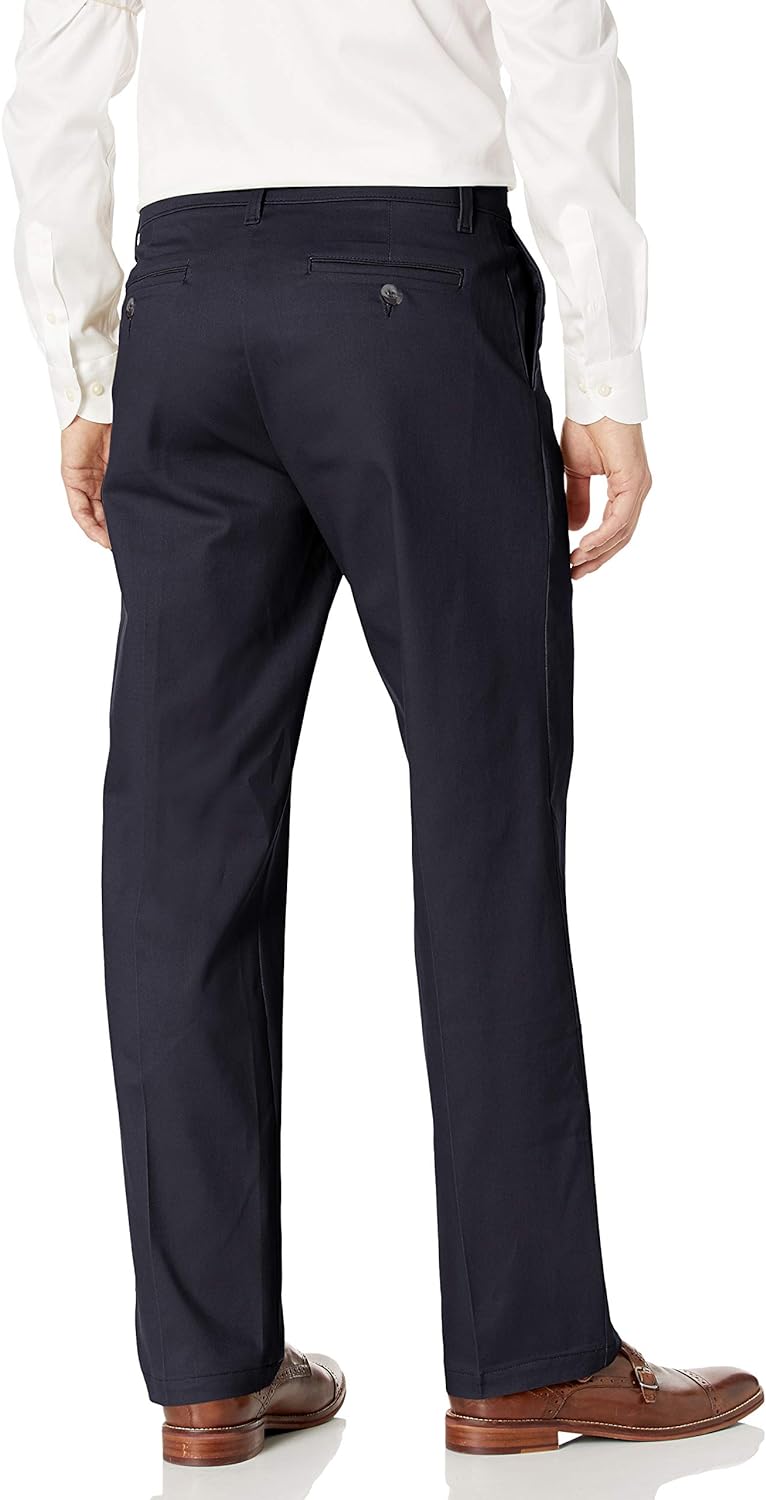 - RELAXED FIT. These mid-rise pants feature a relaxed fit through the seat and thigh with a tapered leg. These flat front pants offer a timeless look perfect for any occasion.