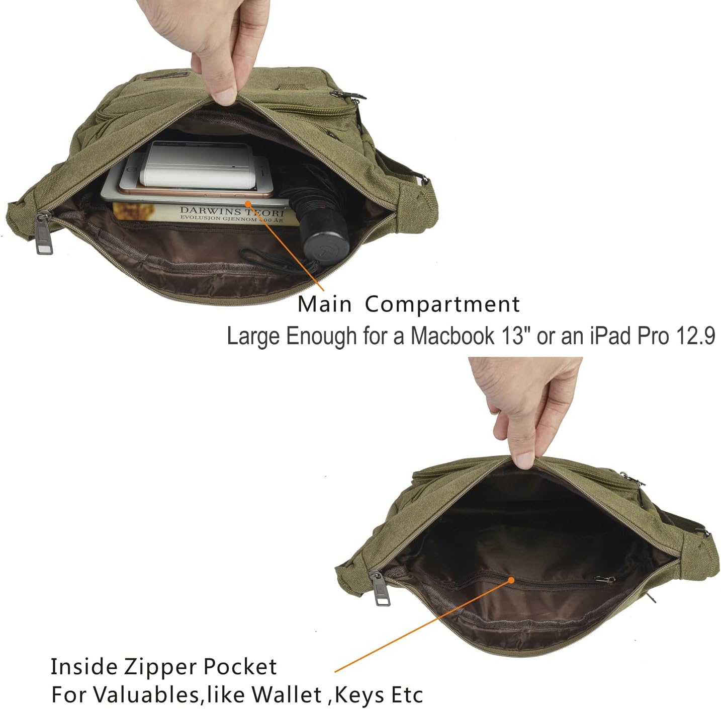 - LARGE CAPACITY & MULTIPLE POCKETS. This roomy laptop shoulder bag fits in a 13.3 inch Macbook pro air, a 12.9 inch iPad Pro, a A4 books, etc in its main compartment. The top-zip closure design ensures your essentials safe. This canvas sathel bag has 6 zippered pockets, one main compartment, 5 zipper pockets and two side water bottle holders.