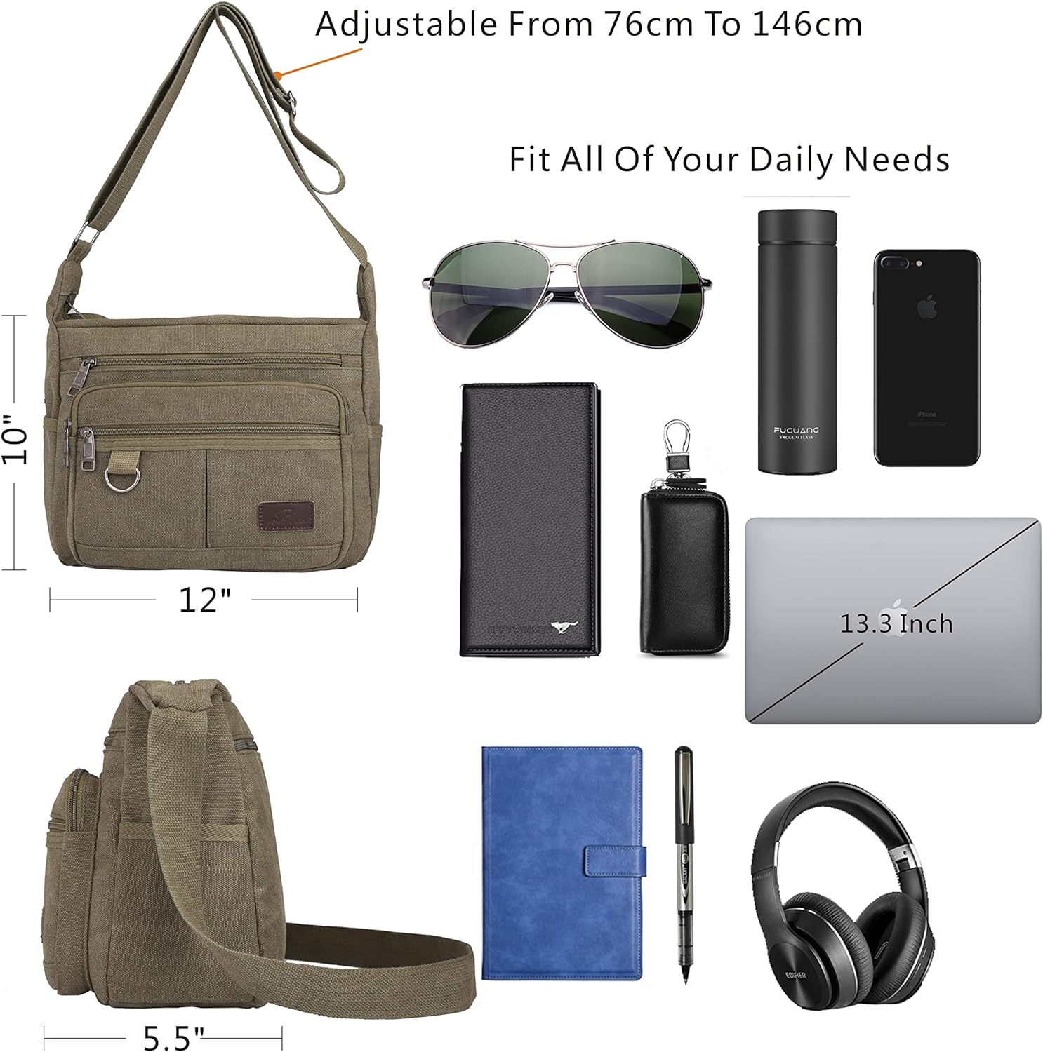 Canvas Shoulder Messenger Bag, 13 Inches Laptop Satchel Bag, Casual Crossbody Bag with Water Bottle Holders for Men Women
