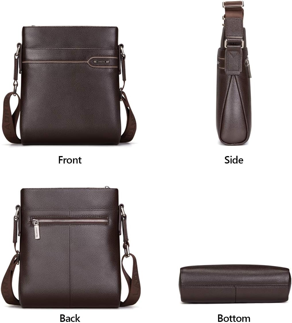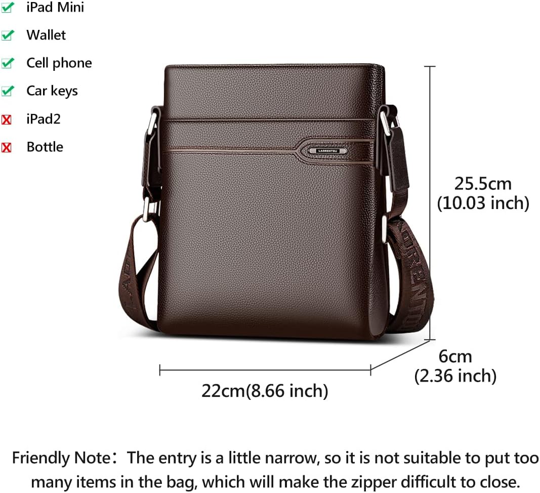 - Reasonable Compartments (Note: This bag can't hold bottle, iPad Air series and iPad Pro series). The real leather business crossbody bag comes with 1 main compartment, 1 interior zipper pocket, 1 small interior open pocket, 1 interior open compartment, 1 external magnetic open pocket (front ) and external zipper pocket (back), meeting your needs for daily activities. It can store iPad mini, cell phone, keys, sunglasses, wallet, etc.