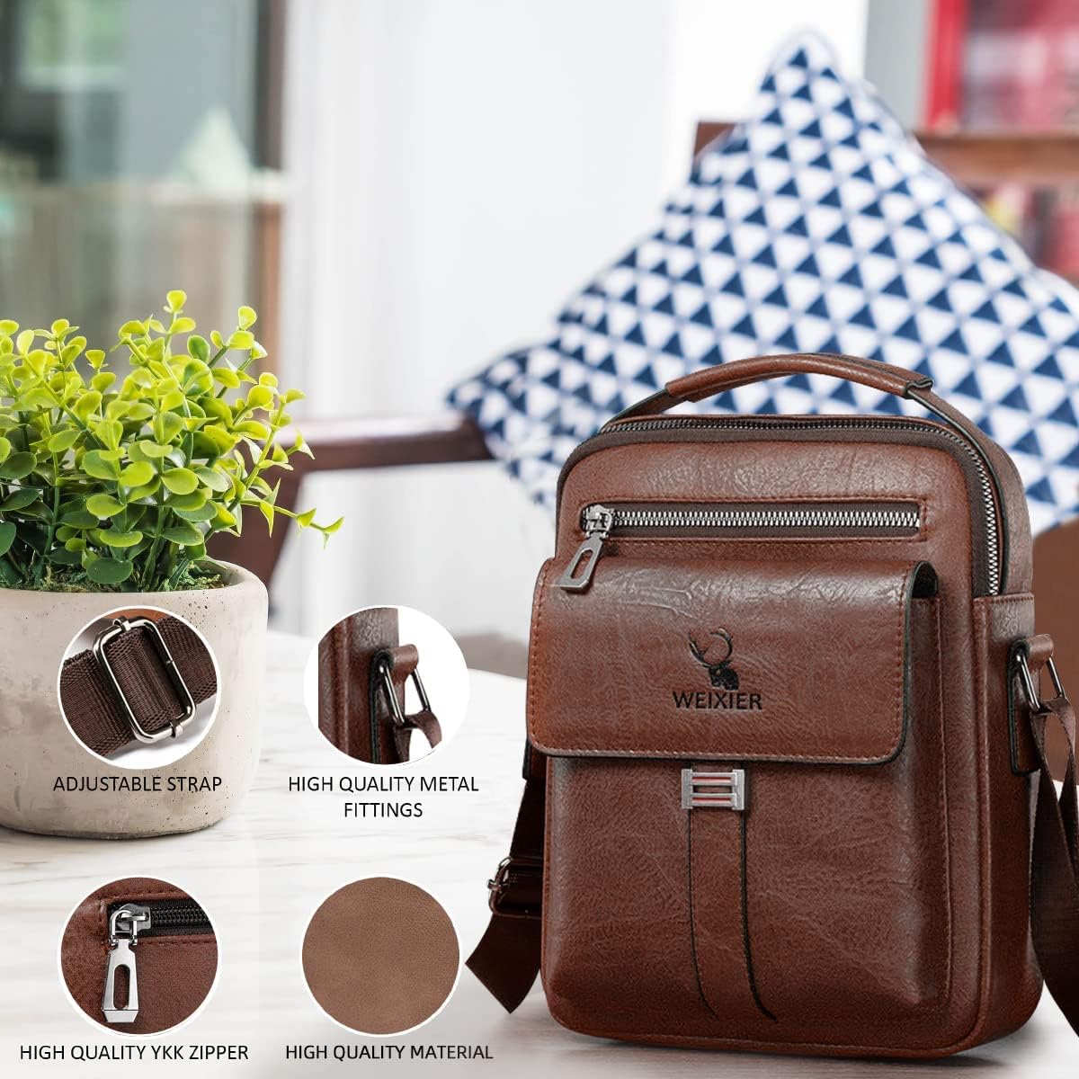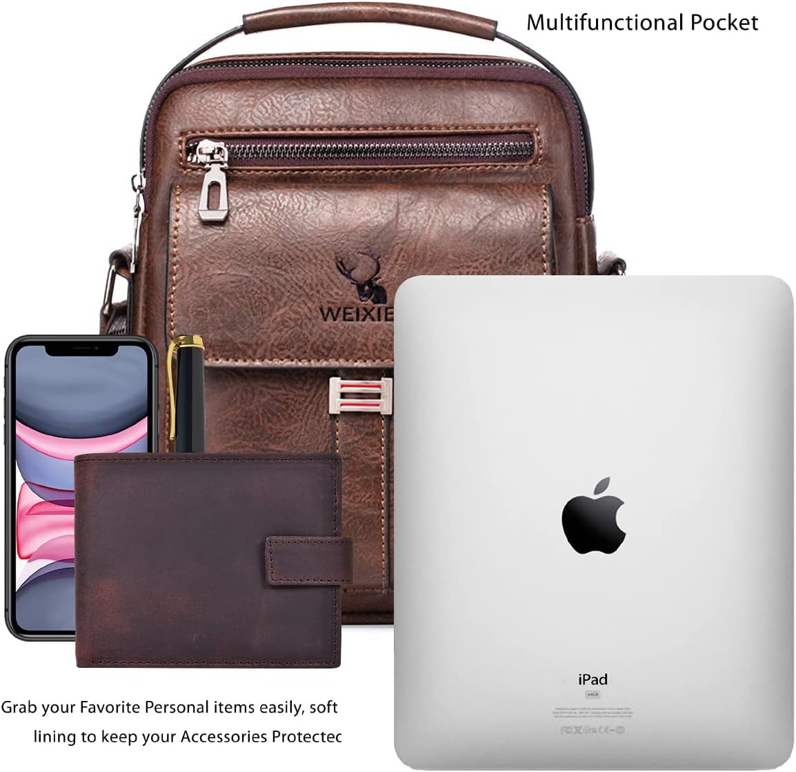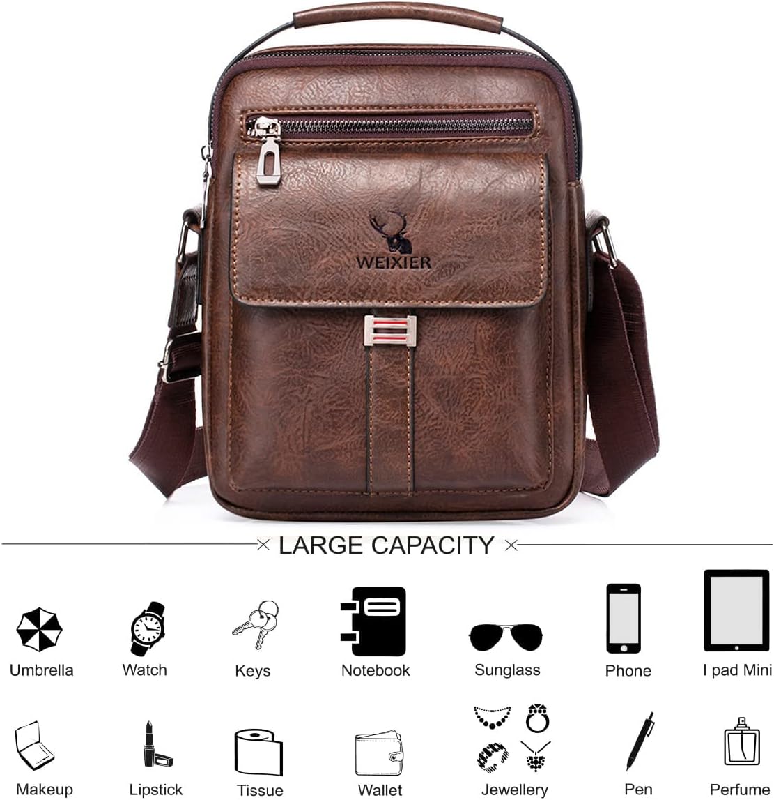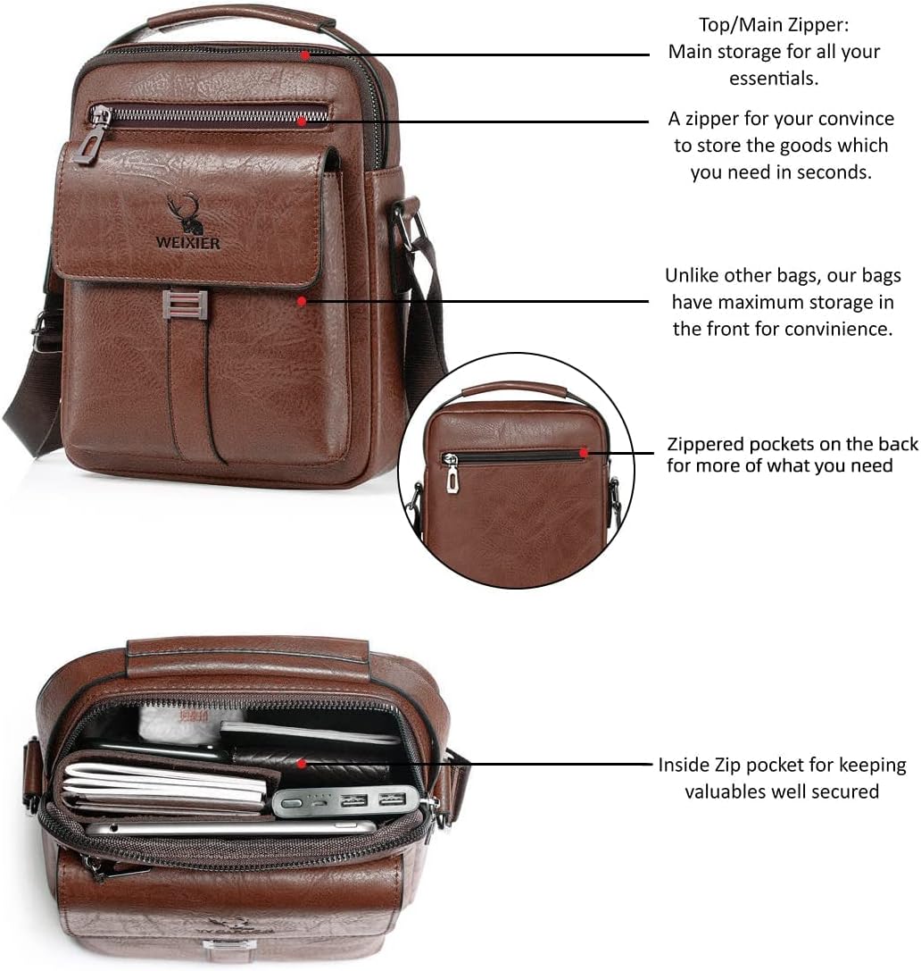- 【Large Capacity Fashionable Shoulder Messenger Bag】Size: 24X8 X 20.5 cm, there are multiple pockets for iPad, mobile phone, wallet, passport, glasses, travel documents, power bank, flashlight, pen, keys, etc. Leather Crossbody Structure: the front pocket is designed with a three-dimensional flap for easy access to items on the go. Zippered pockets on the back for easy storage of your phone or personal items.